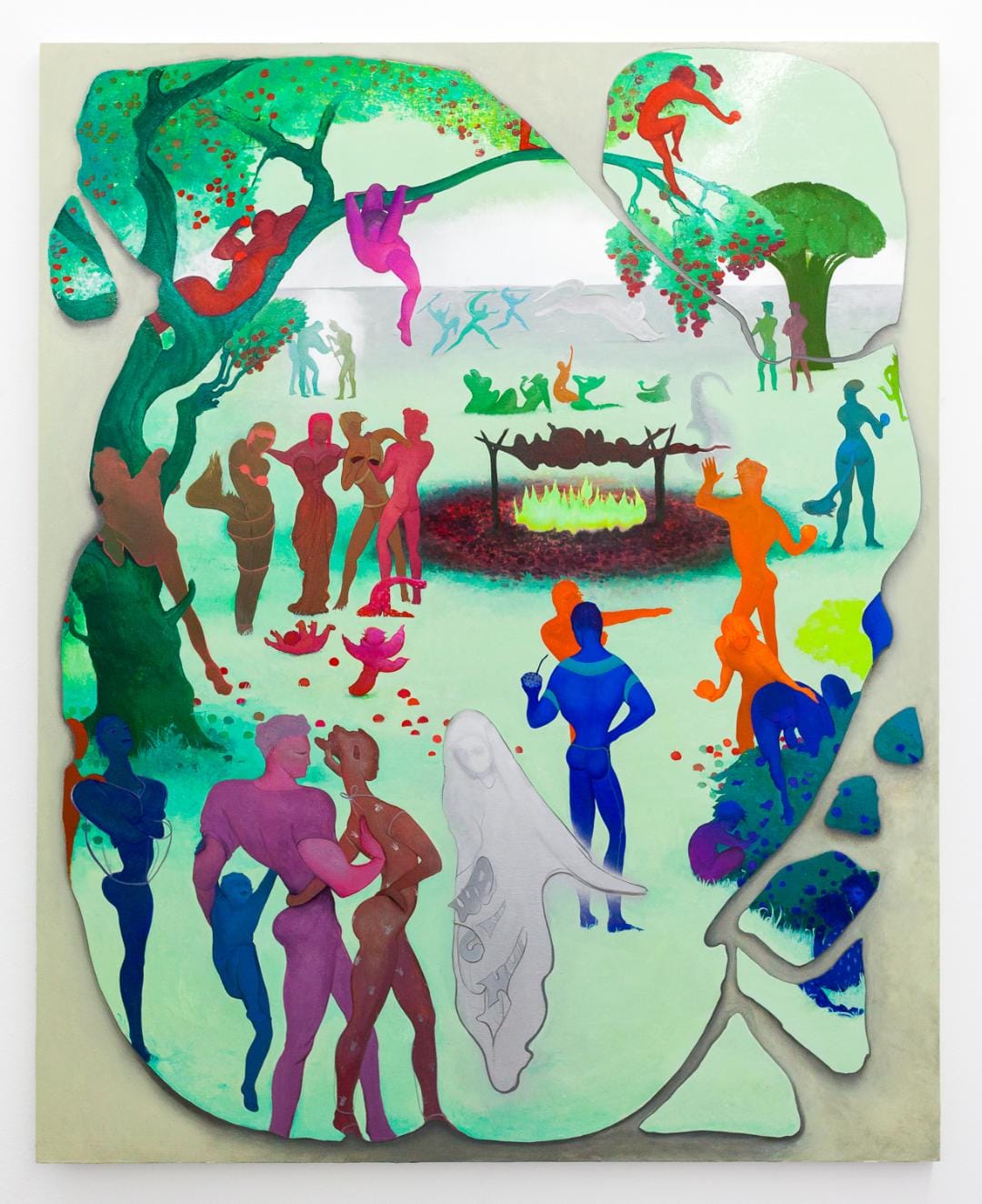 “Welcome to the Gather-n-Hunt” is the show’s most overtly pastoral image. Just as the hard work of shepherds was converted to play in Renaissance pastoral art and literature, Essenhigh converts the early struggle for survival into a pastime in her future. “Nostalgia for our terrestrial history,” reads the text accompanying the painting, “inspired the Gather-n-Hunt, a family restaurant pantomiming the subsistence strategies of our Mesolithic ancestors.” Idealized bodies pass a framing threshold into a special, secluded space. They are greeted there by a ghostly figure — a hologram? — with the bowed head and flowing garments of a Madonna. Once in the pastoral space they cavort in trees gathering fruit or pursue beasts in the background, recalling the hunters in early cave paintings. The scene is not entirely benign, though: the ambiguous form of an unknown creature roasts on a spit at the center, and another bound figure is clearly humanoid: faun-like, it has a fox’s tail and wears a bikini top. Whatever urges our future pastoral gratifies, they include something violent within us.