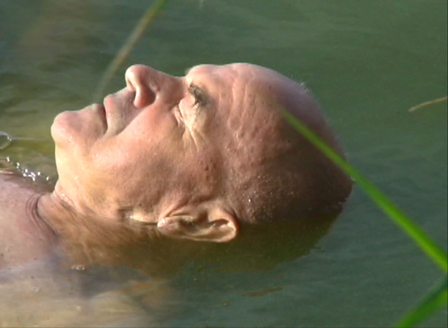 For Bartos, the project has shifted from capturing her father’s unlikely vigor to finding a way for both of them to process the final phase of his life. With her father no longer a god-like figure, Bartos is herself dealing with the reality of his age, and the reminder that she too is getting older. “It Doesn’t Taste As It Used To” serves as an exploration and celebration of nature, while also being a ritualistic farewell to the material world. Throughout the video, Bartos serves as her father’s spiritual guide. Instead of interpreting death as a definitive ending, she helps him to confront the conclusion of his time on Earth, as well as the potential for what may lie beyond. “I explored through this ancient theory that the universe is governed by elements: earth, air, water, fire and spirit. The earth is the most material and primitive element, and there’s a hierarchy where it just goes up,” she explains. The video begins firmly rooted in the earth, with Bartos and her father emerging from the woods, followed by images of her father lying in the grass as if he were about to disappear into it. She then ushers him through the elements — jumping high into the air with him (presumably on a trampoline just out of frame) and giving him a baptismal bath in the river. As they dance wildly in front of a bonfire, their images become increasingly blurred and distorted. “Fire can exist in both the spiritual and material world, and the fifth element can be interpreted as reaching enlightenment, higher consciousness,” Bartos explains.