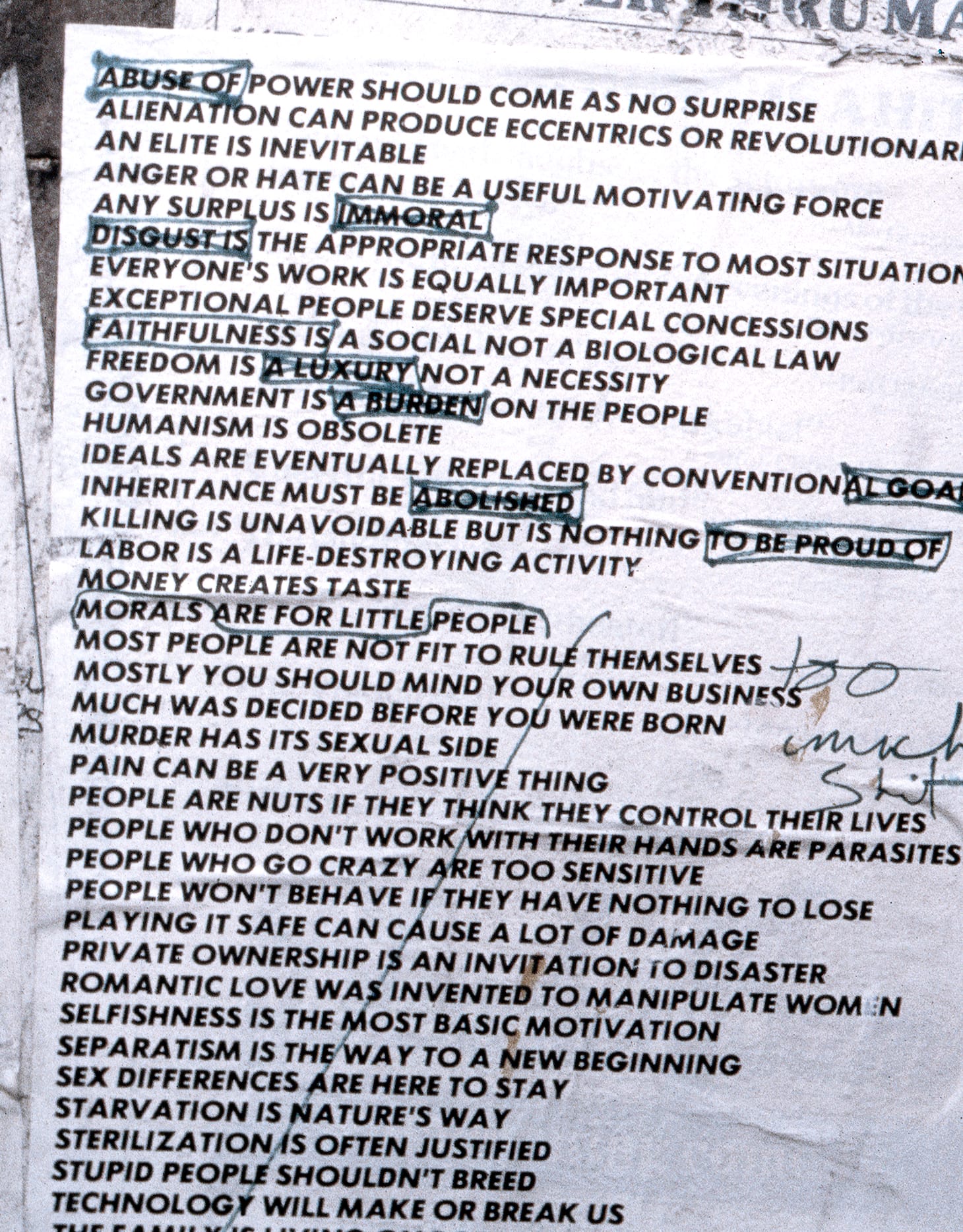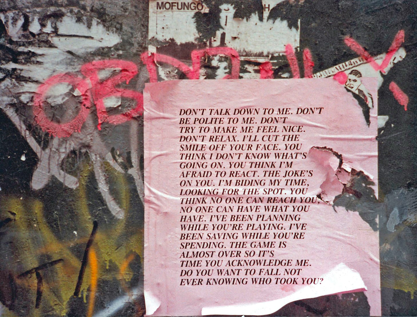 In the earliest and most analog of pieces, her “Truisms” (1977–79) and “Inflammatory Essays” (199–82), words become blow darts, aimed indiscriminately at the general public passing by on the street, doubtlessly injecting a bit of adrenalin into the (pretty gritty at the time) urban environment of New York City.
