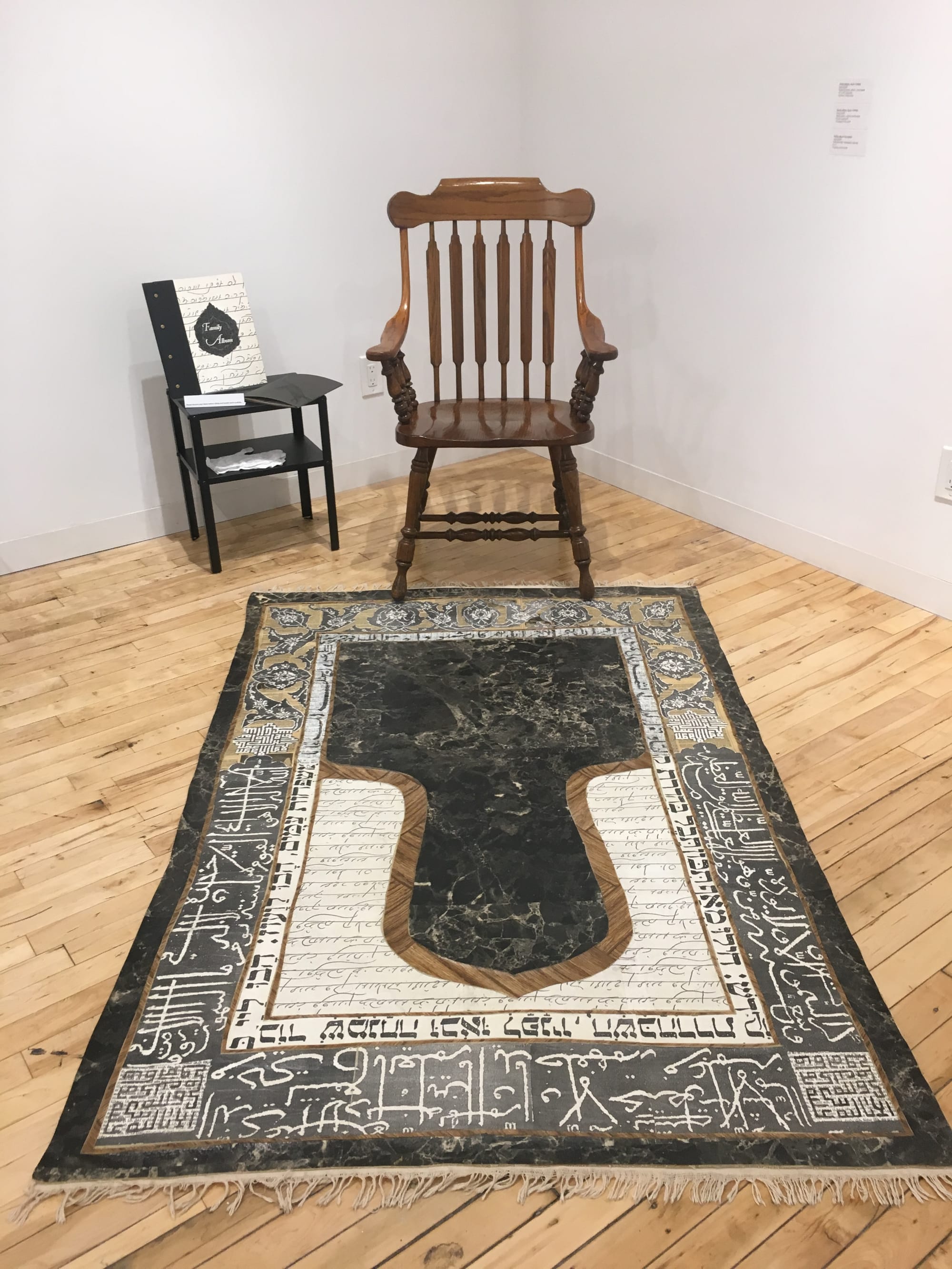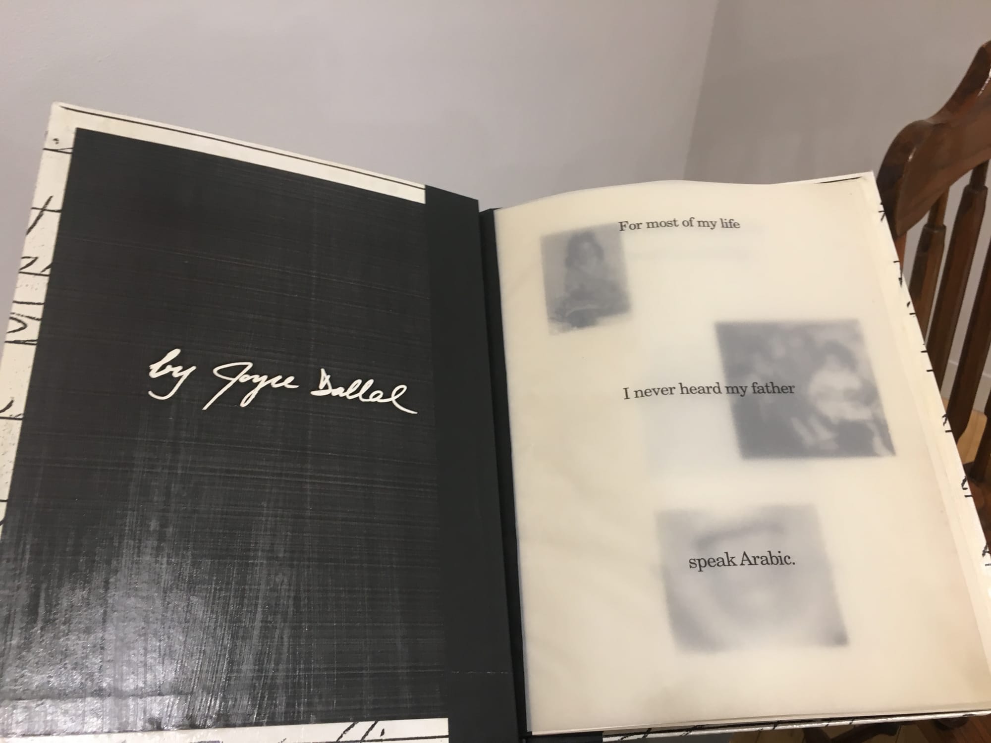 In a corner of the gallery near Ng’s book, Joyce Dallal’s installation Family Album (1992) consists of two self-published photo-books arranged with a chair and a prayer rug. The presentation invites viewers to remove their shoes and to sit and read at leisure. The books recount the experiences of Dallal’s family in Iraq and in America. One opens with, “For most of my life I never heard my father speak Arabic.” The text is printed on transparent vellum sheets, with black-and-white family photos visible behind it: “We are AMERICAN now, my mother would say.” The narrative speaks to the often painful process of cultural assimilation, the middle ground between embracing a new country and identity and retaining a sense of one’s heritage. Dallal also demonstrates the difficulty of seeing conflicts in one’s home country through the lens of American television. The one-on-one format of the book, heightened by Dallal’s intimate reading space, allows visitors into her private story.