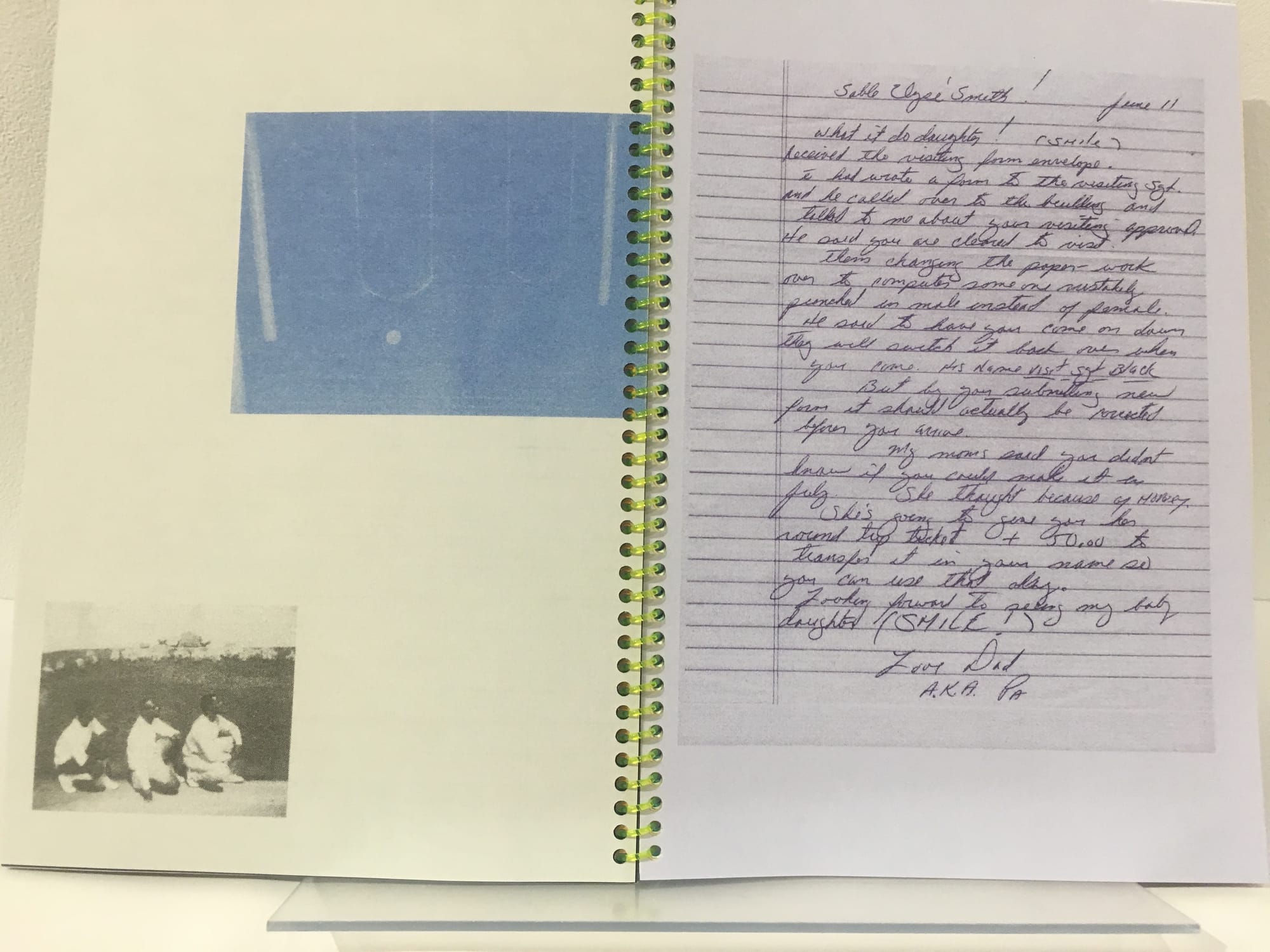 Like Dallal’s books, Sable Elyse Smith’s zine Landscapes & Playgrounds (Sming Sming Books, 2017) deals with family histories, documenting her relationship with her incarcerated father. Smith weaves together handwritten notes and photographs in her unassuming zine — a small, bright blue, spiral-bound book. Letters between Smith and her father, many filled with exclamation marks and signed “Love Dad” or “Love you Miss you Pops,” are interspersed with aerial photographs of the two subjects, made poignant by the context. The images eerily evoke surveillance, in contrast to the intimacy of the letters and children’s coloring book pages. They remind the zine’s readers that these letters were read, monitored, and policed. The fragile zine carries an urgent message about our prison nation, and a more specific emphasis on the toll these surveilled states take on bodies.