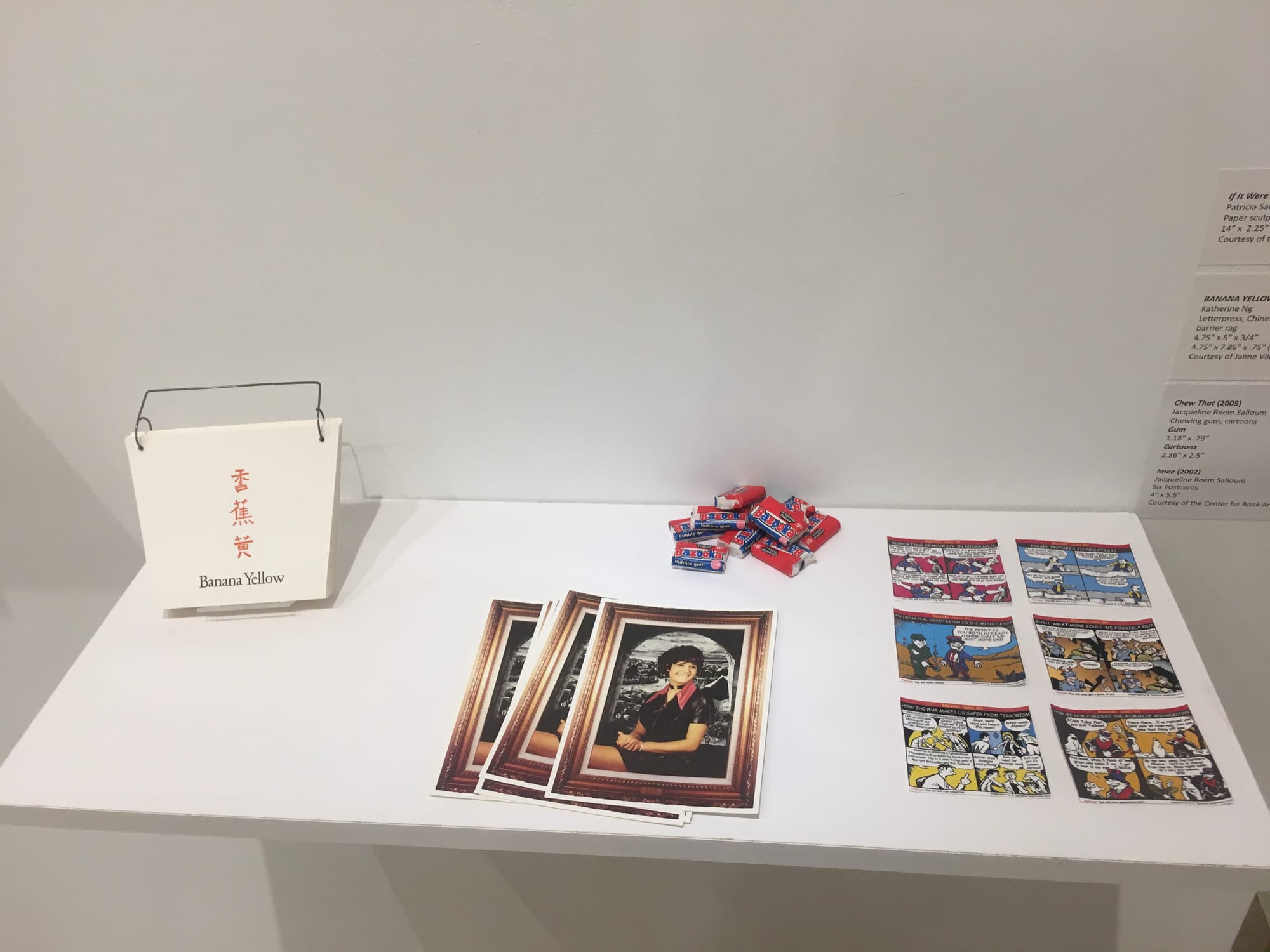 Many of the works included, by women and people of color, voice a sense of marginalization that resonates with Lorde’s assertion that “We see ourselves diminished or softened by the falsely benign accusations of childishness, of non-universality, of self-centeredness, of sensuality.” The works on view embrace a wide spectrum of emotions and subjectivities outside of White-centric definitions of what an “American” is. Katherine Ng’s letterpress book BANANA YELLOW (The Secondary Press, 1991/Pressious Jade, 1992) describes her childhood torn between two identities, not quite American enough, and not Chinese enough for her friends born in China. (“They look down at me for not speaking their language, not knowing their culture, for being born an American.”)