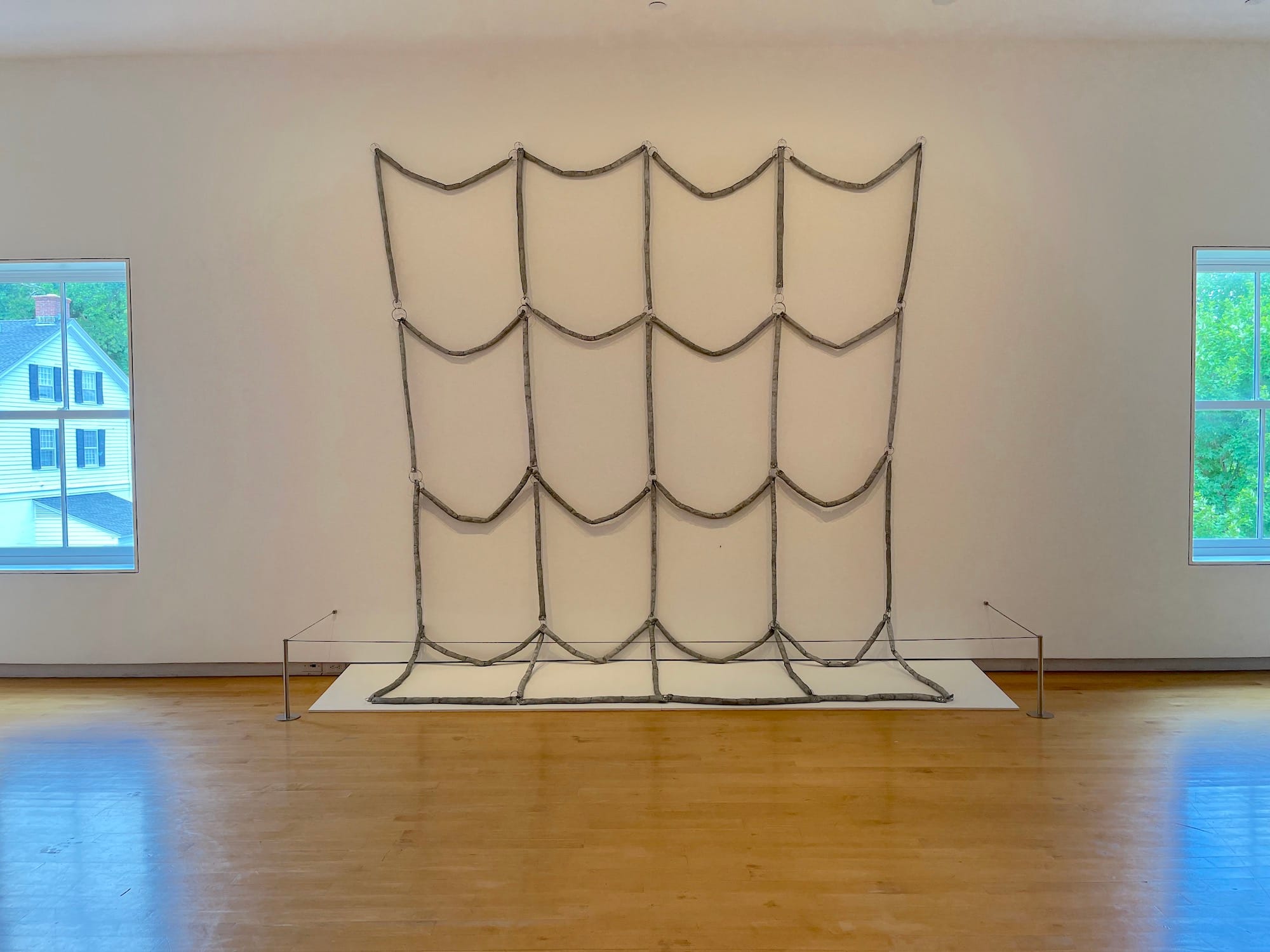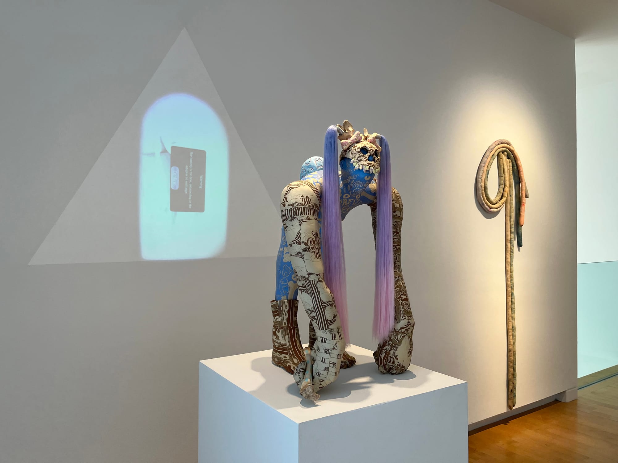 Yet upstairs the works in one room forgo the figure entirely — chief among them an enormous, soft sculptural work by Howardena Pindell, "Untitled" (1968–1970), that teasingly responds to the centrality of the grid in the then-dominant (and male-dominated) minimalist movement. Yet another second-floor room includes work rife with a dark and playful humor, including sculptural installations like Amaryllis Dejesus Moleski’s “The Girl Has Teeth and Teeth Are Tired” (2022) and Pamela Council’s “Ringholders” (2016–ongoing).
