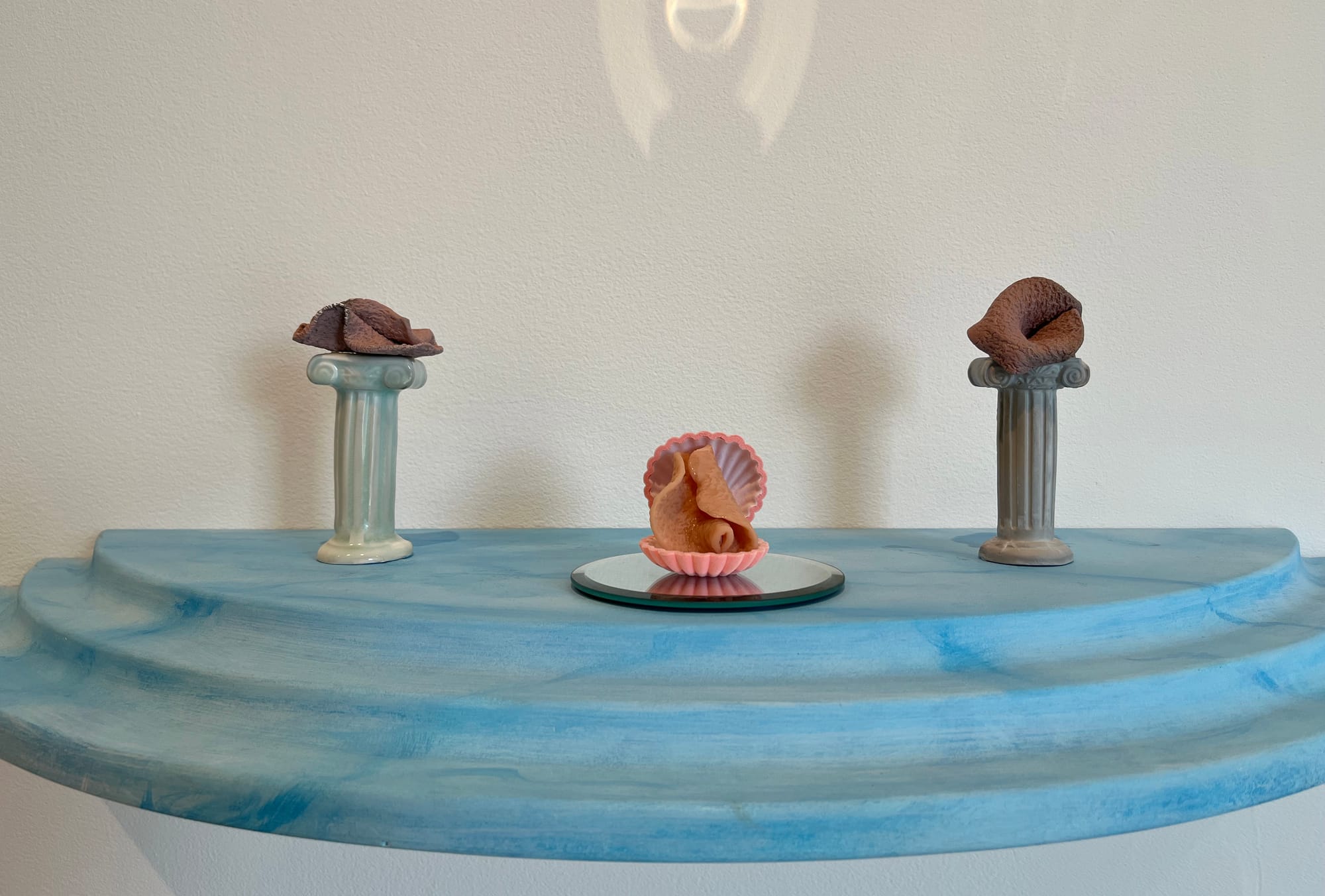 Visitors could easily walk into each room at the Aldrich and pick out a common thread, only to have that commonality challenged. For instance, Loie Hollowell’s “Empty Belly” (2021), in the lobby, evokes the maternal breast and demands on the mothering body, and Cynthia Carlson’s “Untitled Inscape #1” (1970), even without using literal representations of the body, strongly conjures the constant experience of femme bodies being examined, explored, and pulled apart. Then, in a nearby gallery, works by Hannah Levy, Erin M. Riley, Anna Park, and Maryam Hoseini play with or directly reference flesh and sexuality, as well as pleasure and violence. Seeing these works, viewers might be tempted to develop a narrative about the body being central to the art in the show.