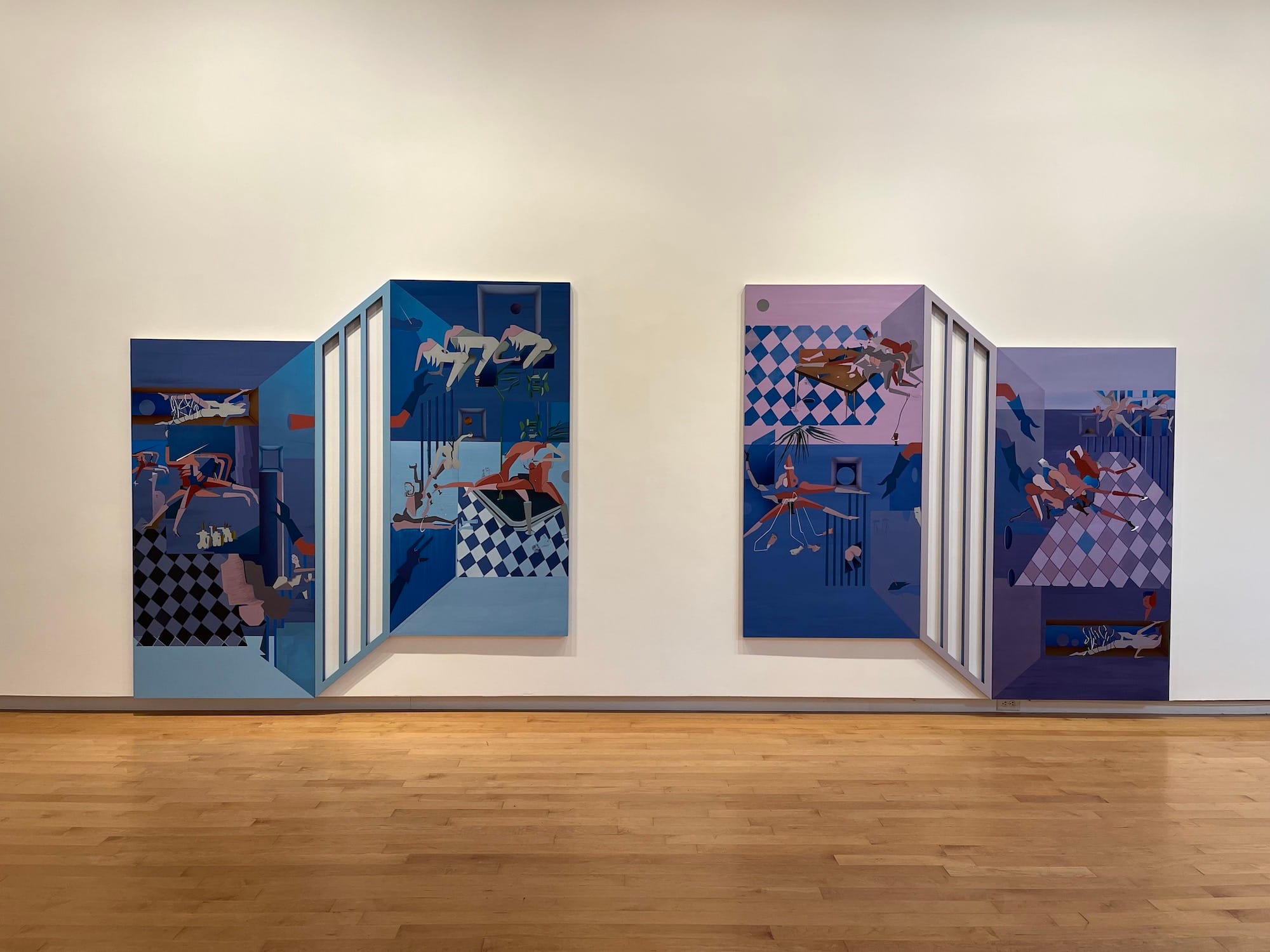 Maryam Hoseini, "Private Quarter (Midnight-Midday)" and "Private Quarter (Sunset-Sunrise)" (2021), acrylic, ink and pencil on panel, diptych