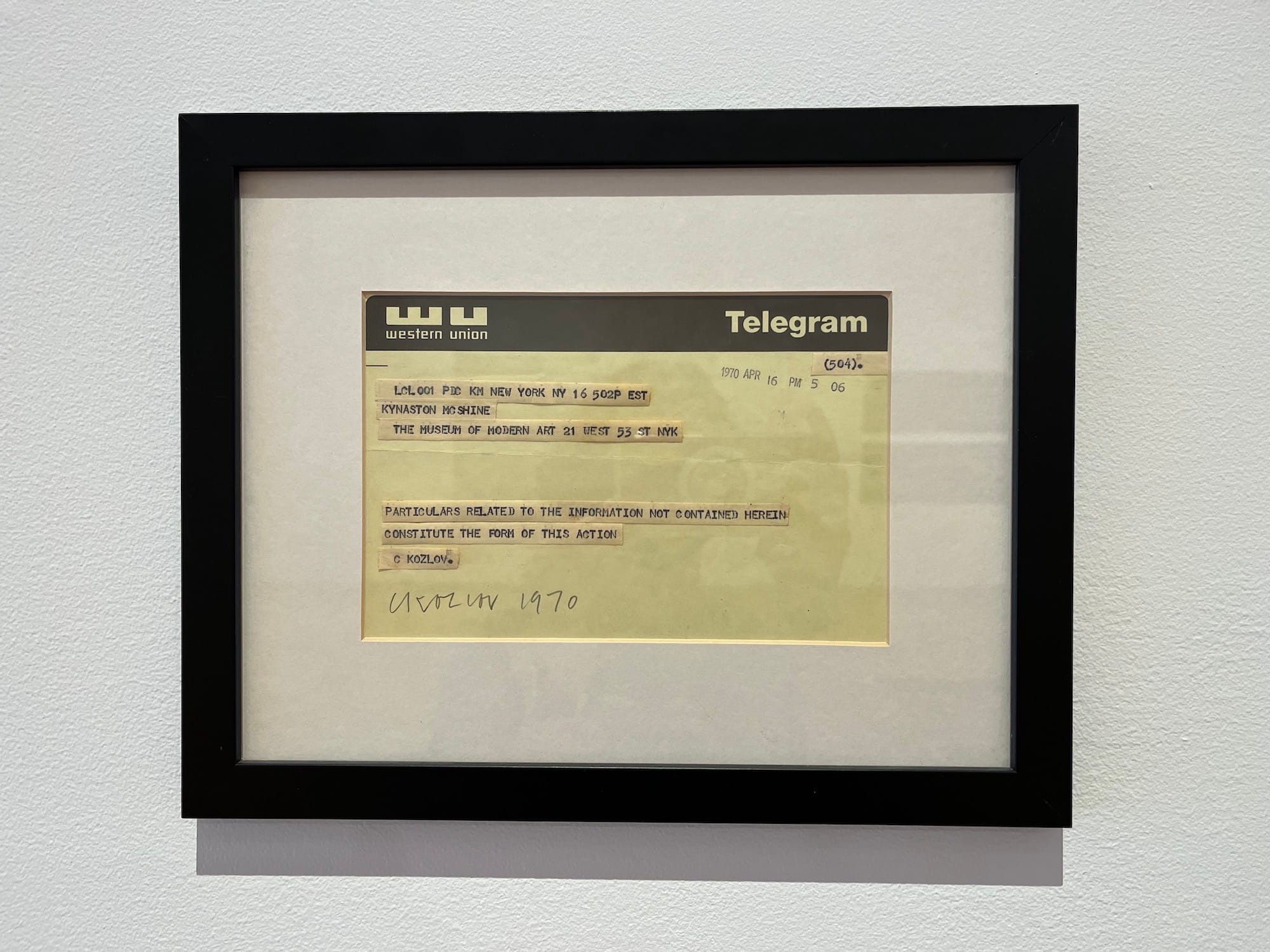 Christine Kozlov, "Telegram addressed to Kynaston McShine" (1970), framed telegram signed by the artist