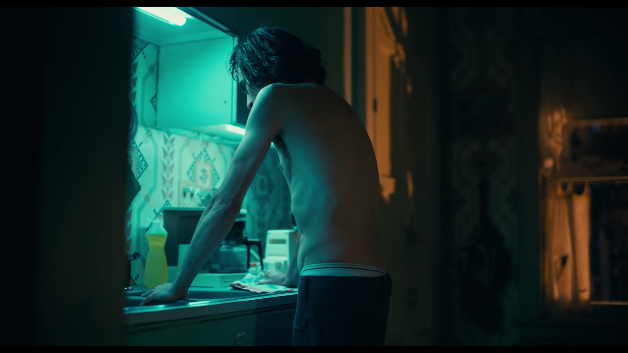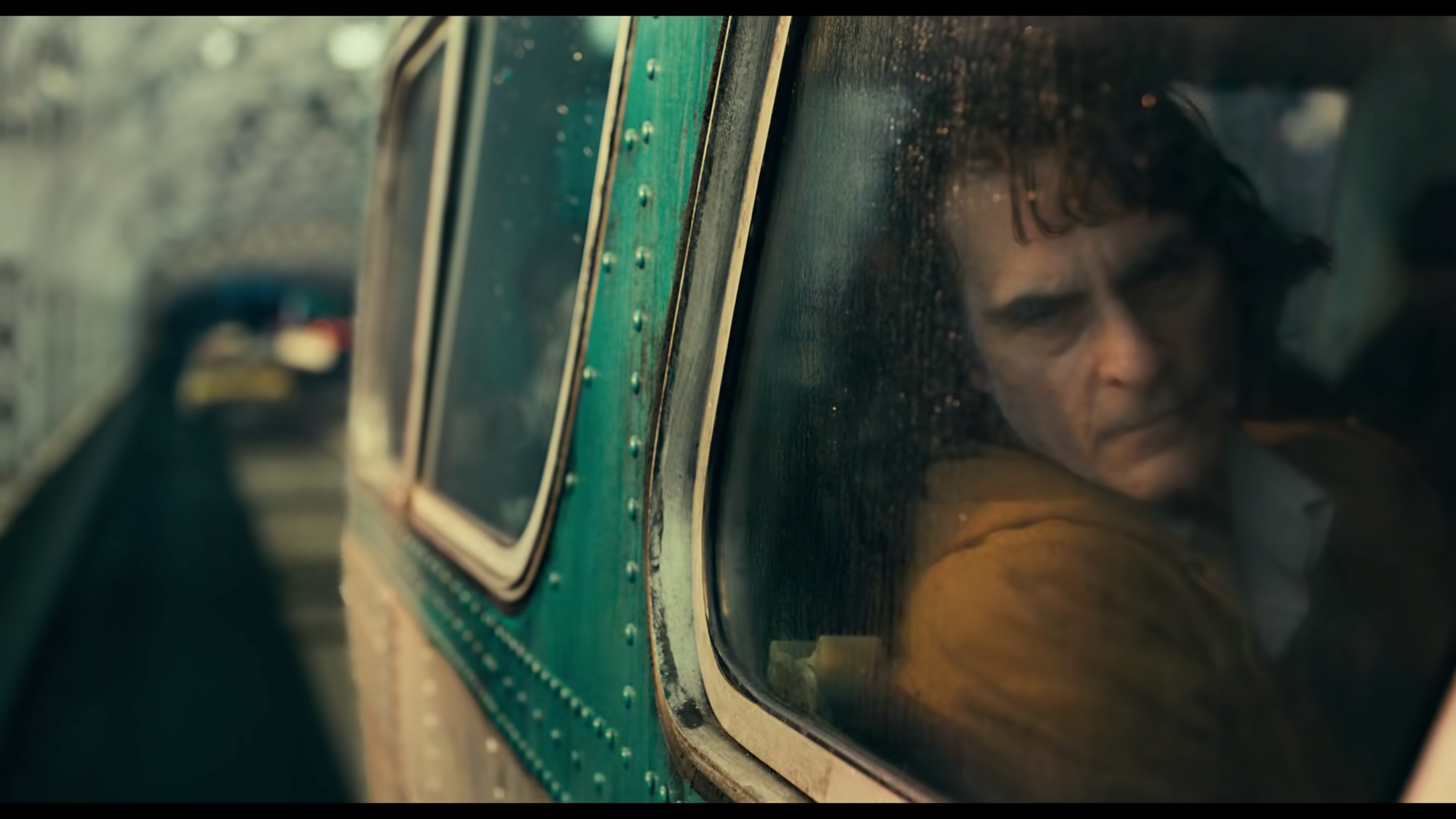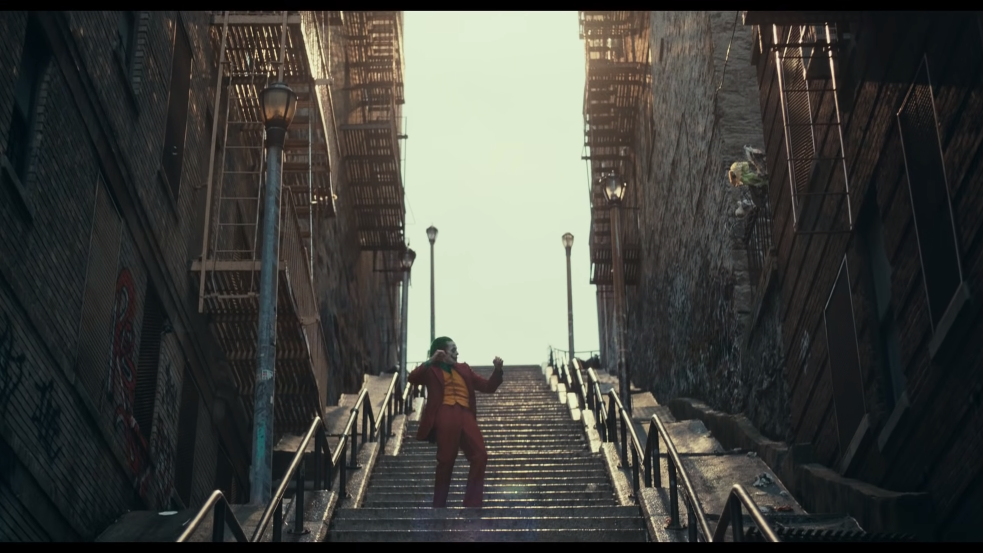 Those Bronx step stairs are in Highbridge, just west of Grand Concourse, the “boulevard of dreams” modeled after the Champs-Élysée and the pride of an area that was a prosperous Jewish and Italian suburb in the first half of the 20th century, before every white family save apparently the Flecks fled the city’s death spiral. The film makes heavy use of prewar apartment buildings way uptown, abandoned Brooklyn subway stations with their cracked and stained mosaic tile, and rundown Deco exteriors in Newark and Jersey City. Despite the Se7en-esque color grading, Phillilps has a feel for architecture which suggests aspiration, decrepitude, and millions of hidden lives, and harmonizes with Arthur’s grand delusions.
