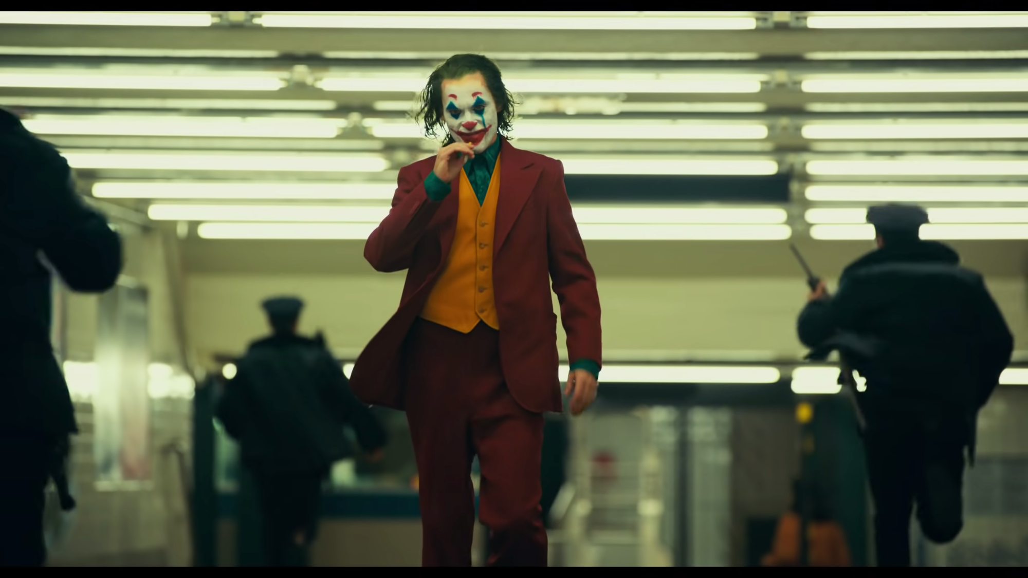 Gotham is a mirror for received notions about urban America, and Joker, with its graffiti and news reports about “super rats” overrunning the sidewalks, evokes the lurid high-water mark of the white flight era, when tall tales of wanton lawlessness rebranded New York as “Fear City” for skittish out-of-towners. Implicit in most coverage of crime in New York in the ‘70s and ‘80s was the idea that the urban population was a problem that had to be controlled. Arthur’s first kill comes in response to subway harassment, in an obvious echo of Bernard Goetz opening fire on four young black would-be muggers on a 2 train in 1984. Here, though, the menace comes in the form of three slick-haired banker douchebros. Arthur, as an anonymous clown-painted avenger, becomes a figure of notoriety. His rampage, like Goetz’s, is splashed across the covers of Gotham tabloids, which are as alarmist and crime-obsessed as New York’s. He then becomes the totem of a clown-masked Occupy-esque protest movement.