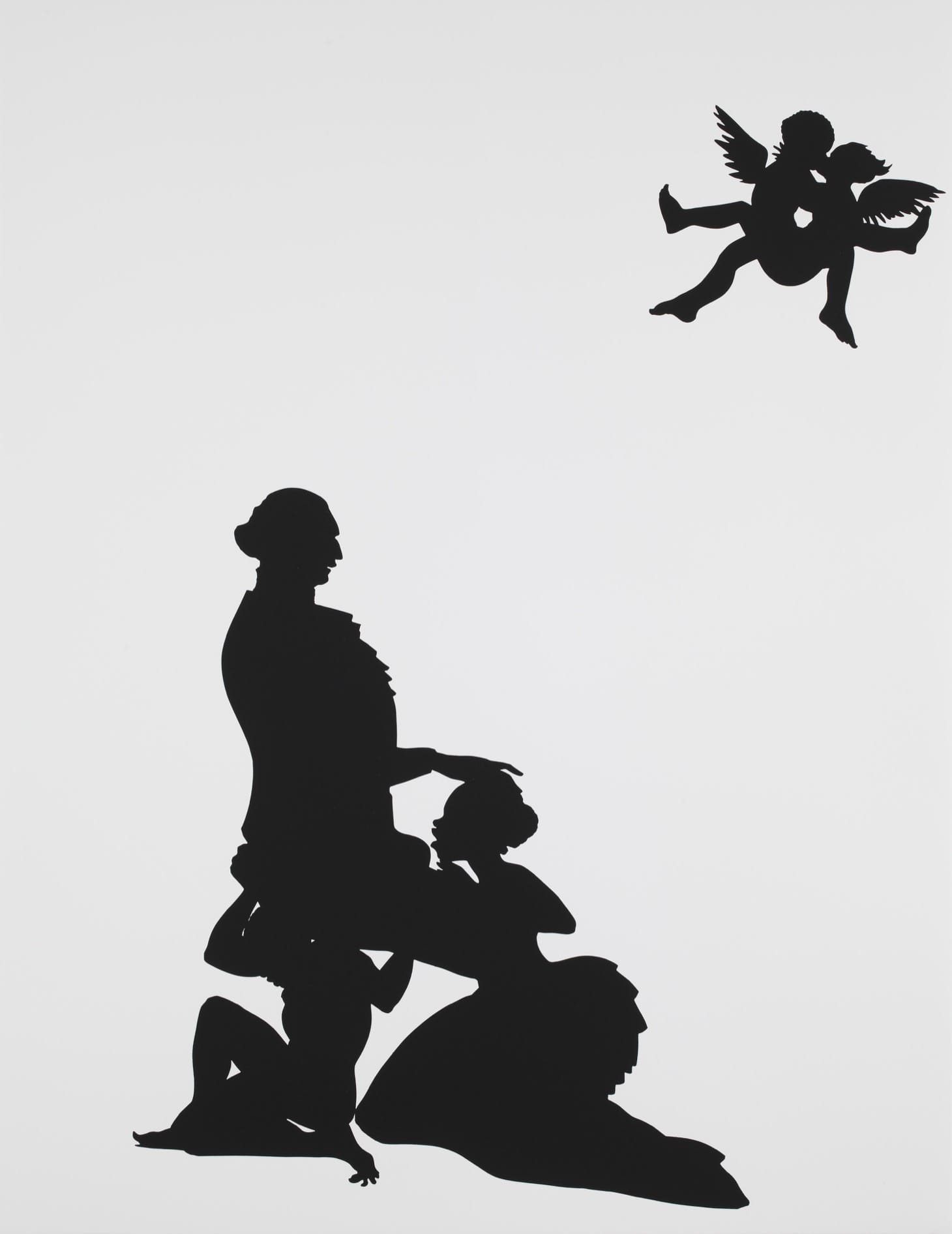 Kara Walker’s 27-screenprint series The Emancipation Approximation (1999–2000) takes a very different tack in relating the stories that winnow out from the history of the ownership of Black bodies in the United States. The silhouetted images are all about the interrelation of sex, desire, violence, and dehumanization that was endemic to the system of slavery. Using the figures of swans, angels, severed heads and just-birthed babies raises the horror in the series to the point where it becomes almost exultant, which is always the stumbling block for me with Walker’s work. It revels too much in the violence it depicts.