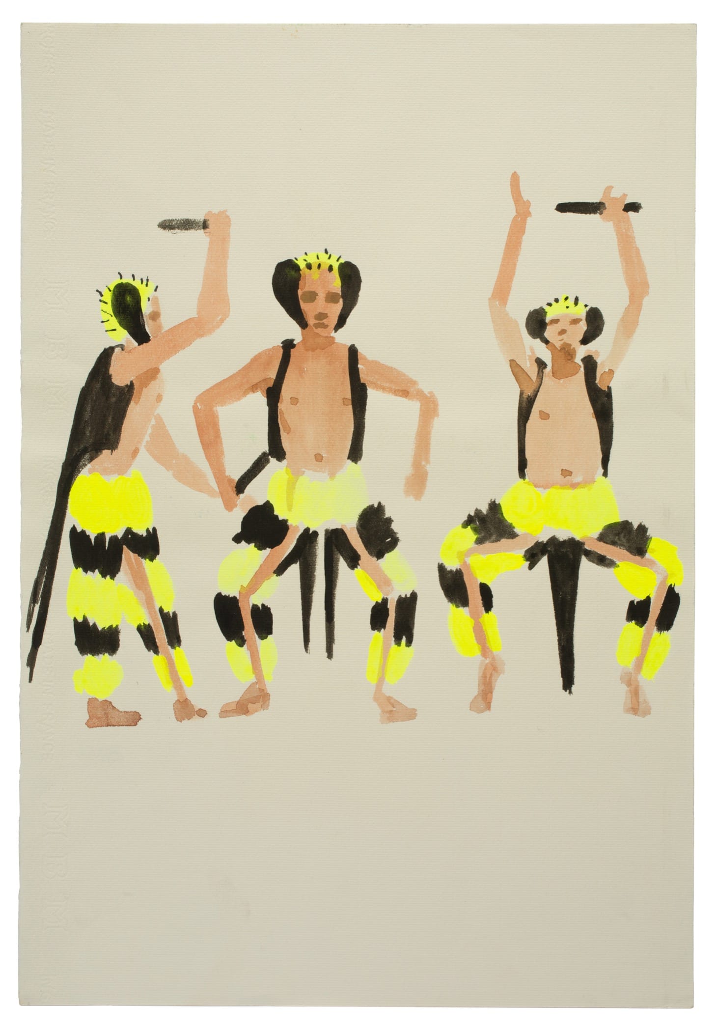But the show ends on a buoyant note with drawings from an archive of Frank Moore’s drawings associated with the ballet and film he made more than 30 years ago with the dancer Jim Self: Beehive. The work is playful and even silly, imagining what it would look like if humans merged with bees into a new species. Here the narrative weaves itself together through drawings of costumes, set designs and cartoony flights of fancy. It’s wonderful in evoking how stories actually don’t require a beginning, middle, and end to be compelling tales.
