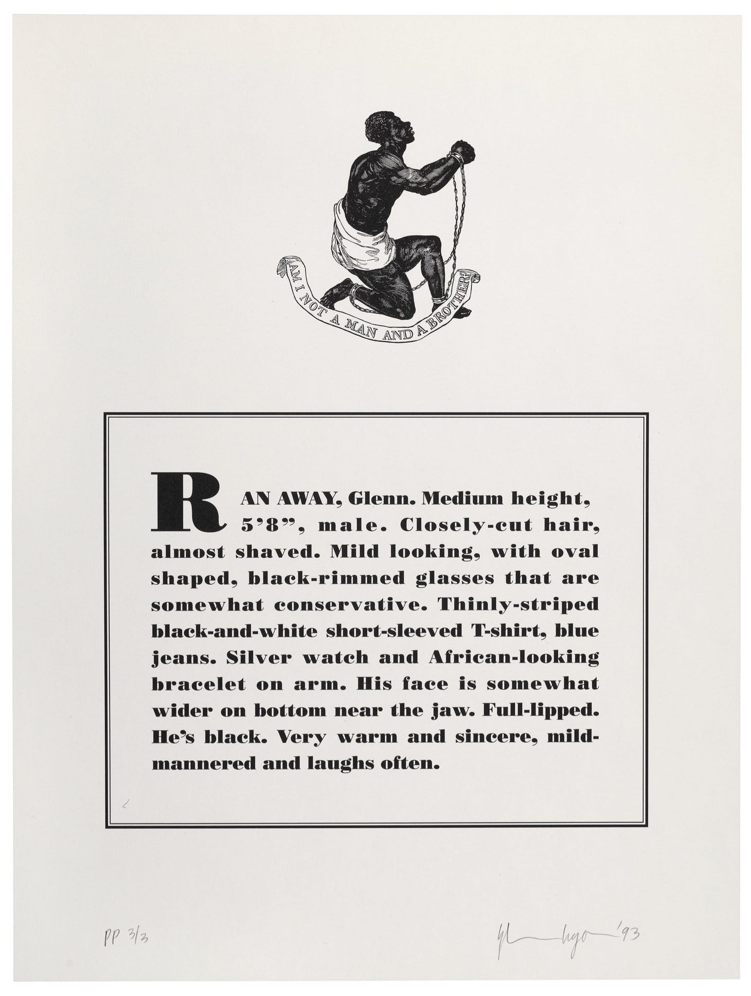 Storytelling becomes humorous in the hands of Glenn Ligon. His “Runaways” (1993) lithographs consist of accounts given by friends who describe him for the benefit of others. He has placed these accounts in the form of a “runaway slave” notice and they play off both his agency (to make such a piece) against the historical circumstance of the notices, which meant the life and death of actual people. They are difficult to assimilate, but do elicit laughter at the contradictions. After all, the descriptions are odd: “mild-mannered, very warm and sincere” sounds like an alien’s approximation of a real human being and show how the very structure of the story form can distort and skew the characters being depicted.