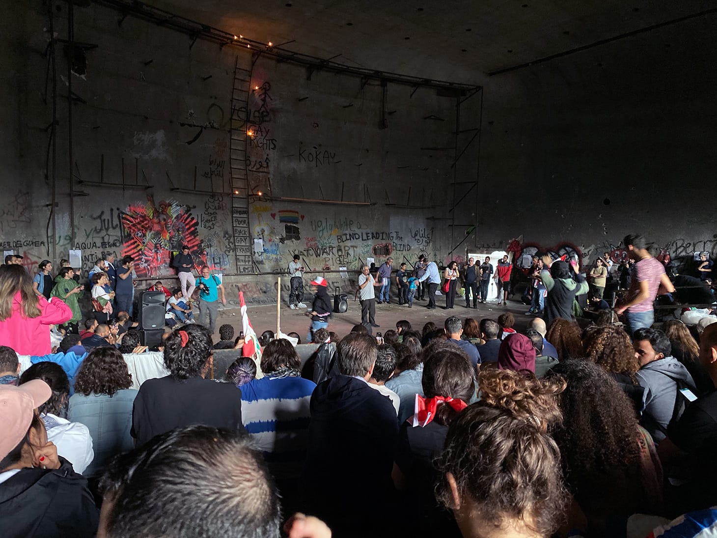 Another open-air gathering of Lebanese artists earlier this week led to debates about arts role in the protests, but the conversation seemed to veer off course when there weren’t basic agreements about what artists should do during such a crisis. Participants discussed events in Hong Kong, Egypt, Sudan, and elsewhere, demonstrating that the global wave of protest continues to inform one another. A group of self-described academics, artists, teachers, students, and intellectual workers have also organized an occupation of the “Egg,” as its commonly known, near the downtown protests. The theater space has stood unused since the start of the Lebanese Civil War. Protesters broke down the gates of the site to create a “common space to hold political debates, proposals for direct action, teach-ins” and other activities. For instance, on Thursday, October 24, American University of Beirut professor Charbel Nahas, who some in attendance were affectionately calling “Lebanon’s Bernie,” gave a lecture on the “Crisis of Capitalism,” which was followed by a Q&A.