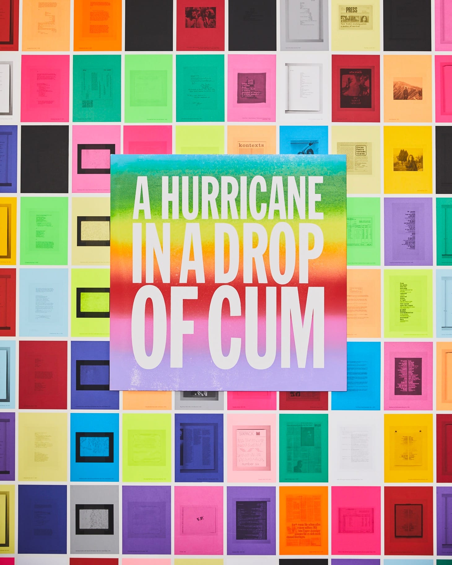 Later, in books with not-ready-for-New Yorker titles like Balling Buddha (1970) and Shit, Piss, Blood & Brains (1977), he took the lessons he’d learned from the Pop artists even further, repeating sentence fragments like incantations or placing two copies of the same found text side by side, in slightly misaligned columns, so the eye ping-pongs between them, creating visual and textual echoes. Still later, he dragged poetry readings into the age of Op art, LSD, and Marshall McLuhan by performing with multitracked recordings that doubled, tripled, quadrupled the lines of his already repetitive texts. Live, in performances like the ones on his record You’re the Guy I Want to Share My Money With (1981), released on his Giorno Poetry Systems label, he weaved his voice around the backing tracks to produce a mind-numbing mandala of sound and meaning.