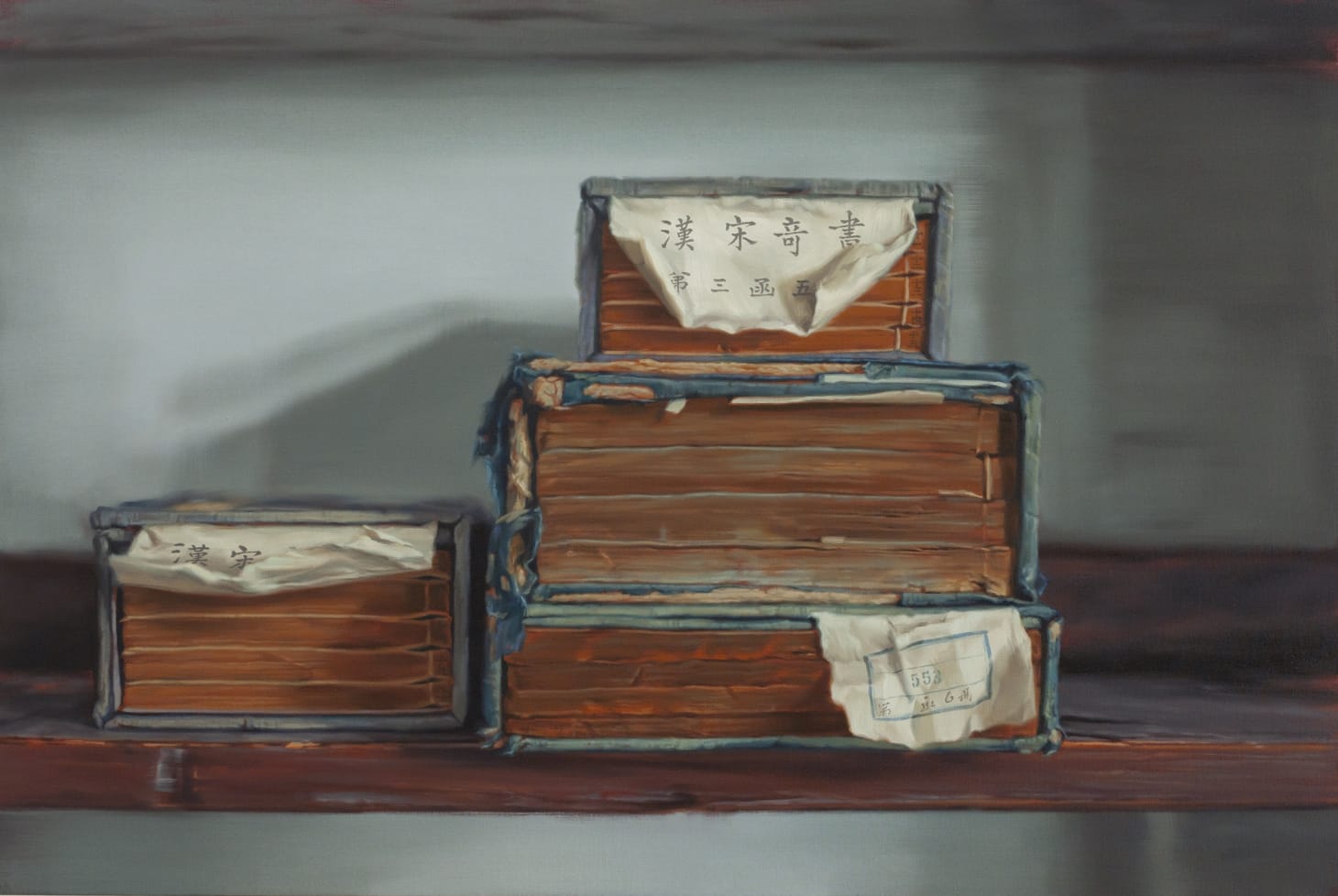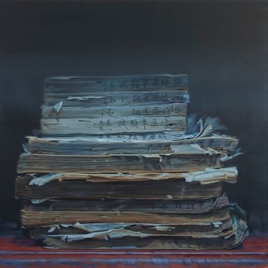Xie has long made books central to his artistic practice. Born in China’s rural Guangdong province, the now Palo Alto-based artist was deeply affected at an early age by memories of his father, a school principal, being forced to collect books banned by Chairman Mao during the Cultural Revolution for their eventual destruction. Now a professor of art at Stanford University, Xie’s move to the United States in 1993 marked the beginning of his fascination with books. He began making international excursions back to China, in order to investigate the repositories of Chinese libraries and make paintings of what he found.
