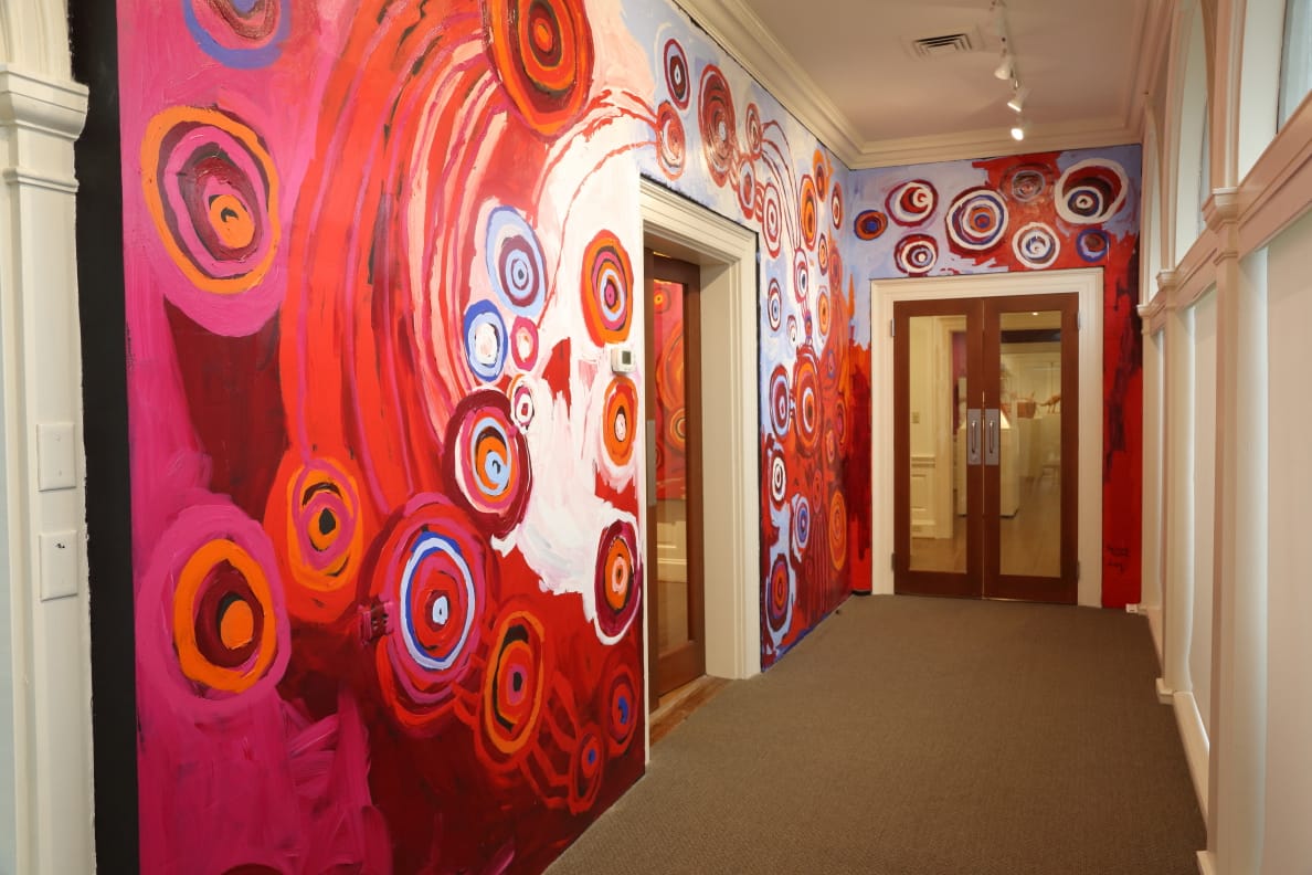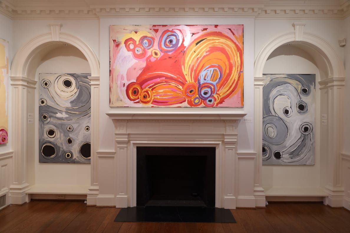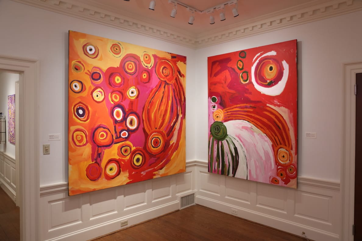 In early November, Moore and Adamson, accompanied by Annie McLoughlin, manager of Tjala Arts, did a two-week residency at the Kluge-Ruhe. During their visit the two artists painted a mural, also titled “Ngayulu Nguraku Ninti,” in the interior breezeway of the museum. Led by Moore, they created a lively, joyful and immersive space that conveys their connections to their homeland.