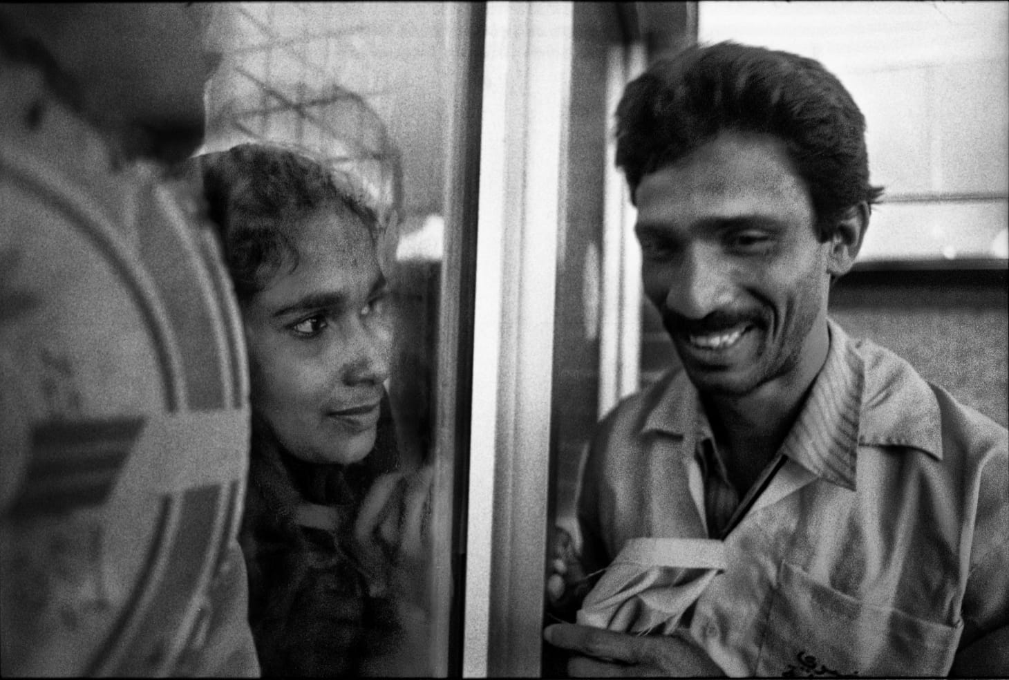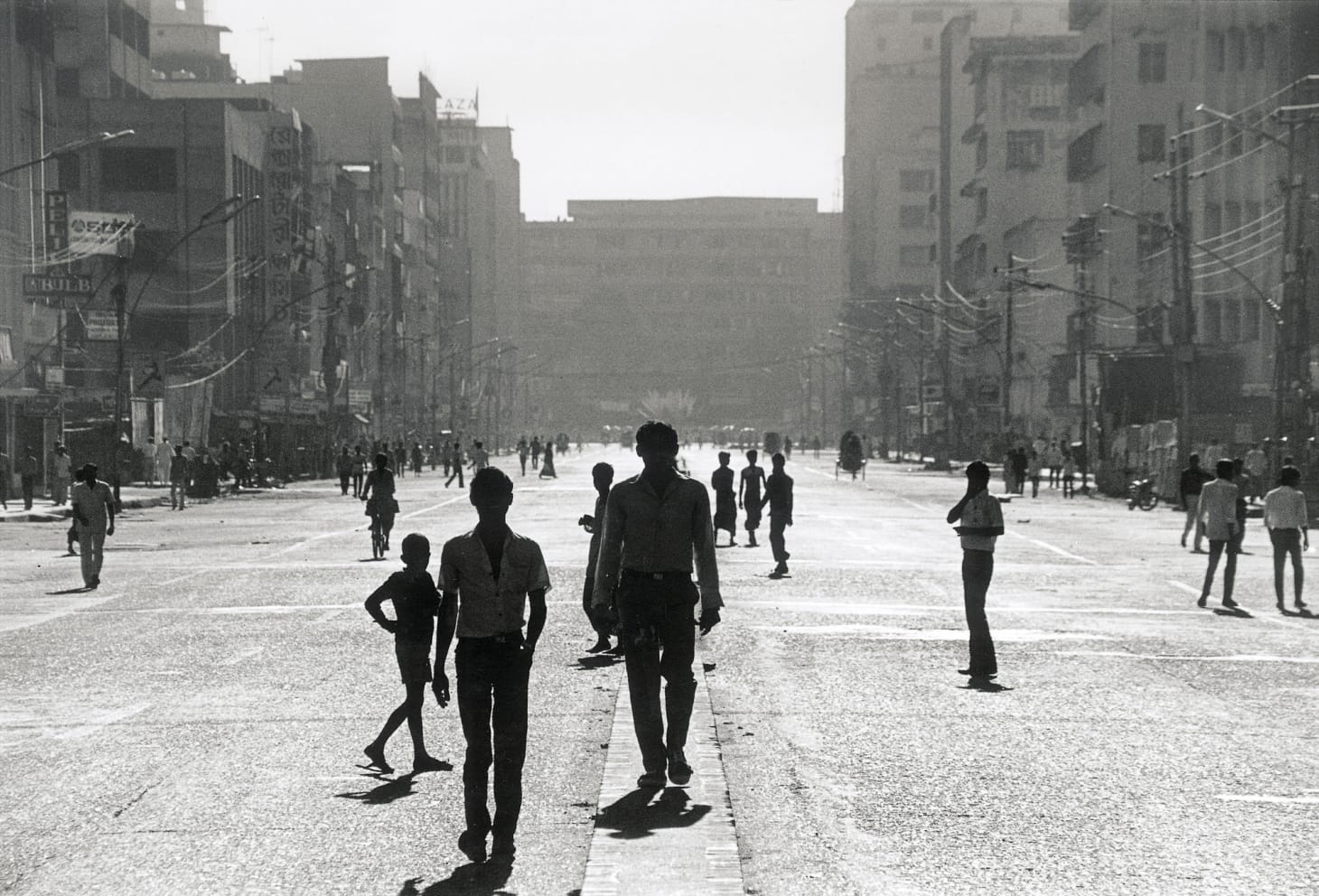 Alam’s early photographs are very much in the spirit of Henri Cartier-Bresson’s photos of India from the 1940’s. High contrast and dramatic framing heighten the narrative. In his photo from 1987, “Protesters in Motijheel Break Section 44 on Dhaka Siege Day,” he presents a formalist view of an urban street, a wide and long expanse framed by buildings. Backlit, the figures of the protesters are sharply thrown into shadow. They appear as dark cutouts in a brilliant haze of light. Everyone in this photograph is moving. There is an air of expectancy, unrest; at the same time the elegant lighting and composition reads simply as a beautiful moment captured on film.