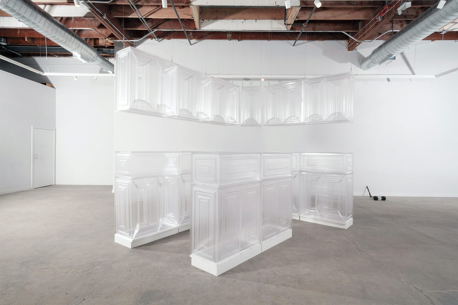 Barker explains how “creating a standard means someone like me deviates from and is oppressed by it.” The exhibition’s pièce de résistance, “Untitled (Kitchen),” forces viewers to experience what this feels like. Made in collaboration with Tomasz Jan Groza, these scaled-up cabinets tower above the viewer. Despite their literal transparency, they’re frustratingly inaccessible. The feeling is that of being a child. It’s also the view from a wheelchair.
