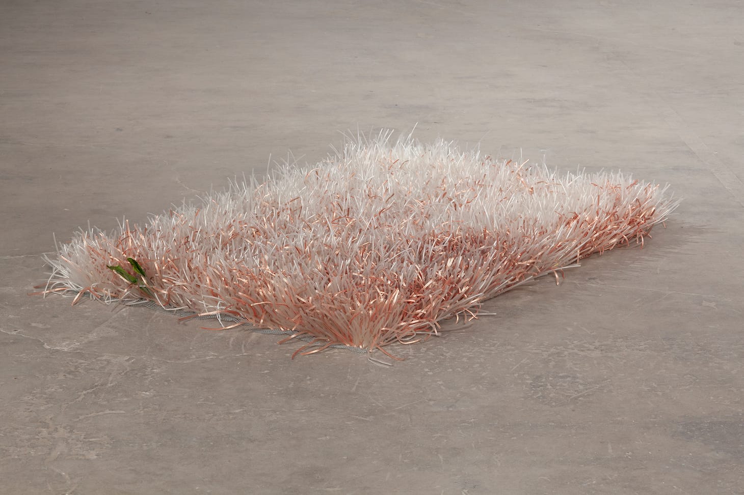 Plastic is a common medium throughout the show, such as in “Untitled (Rug),” made out of countless bits of intravenous tubing, to which the artist has spent great deals of time hooked up for surgeries, blood clots, and infections. Thread between the plastic stems is copper. Six inches thick, the rug would pose an insurmountable barrier for a wheelchair. Even modest carpeting can render wheelchairs useless, calling attention to the ableism baked into the most ostensibly mundane items.
