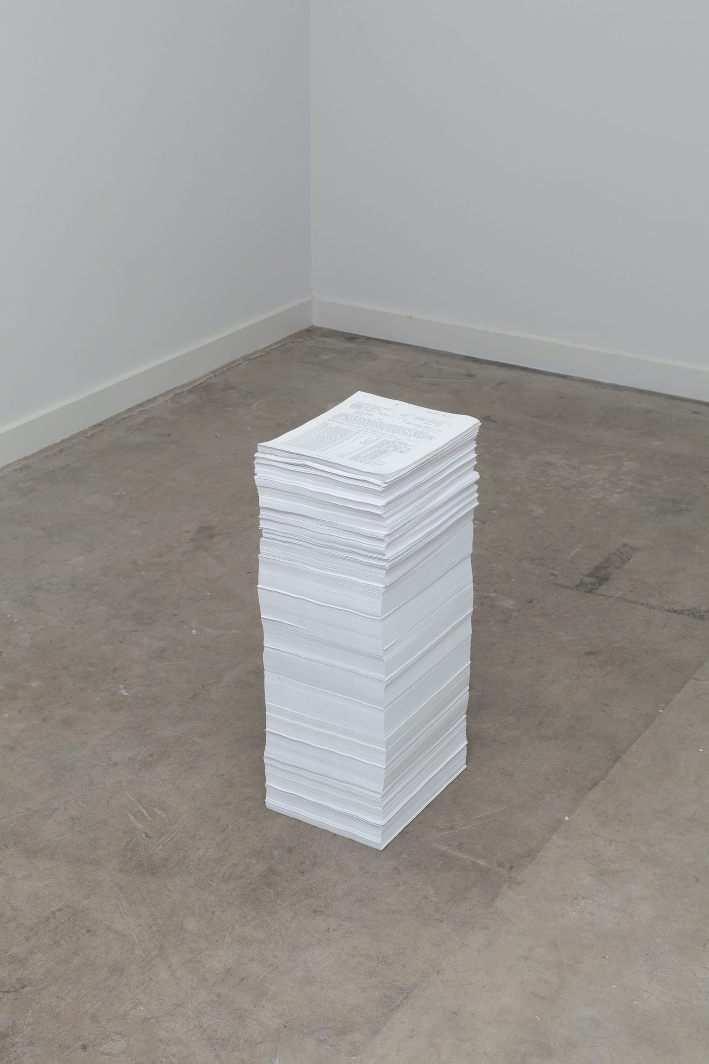 Other impediments are less visible still. A huge stack of paper contains $700,000 worth of medical bills, spread over 7,865 pages. With this piece, the artist makes painfully public the resources required to keep disabled people alive, costs increasingly passed onto patients by profit-mongering insurance companies — to say nothing of the countless hours spent wrangling with the medical-industrial complex. Throughout the gallery echoes “Opus No. 1,” a popular choice for hold music. The artist waits on the phone, waits for change. “Unlike when ships sink and they save the most vulnerable first,” Barker points out, “the healthcare industry seeks to capitalize off of these groups.”