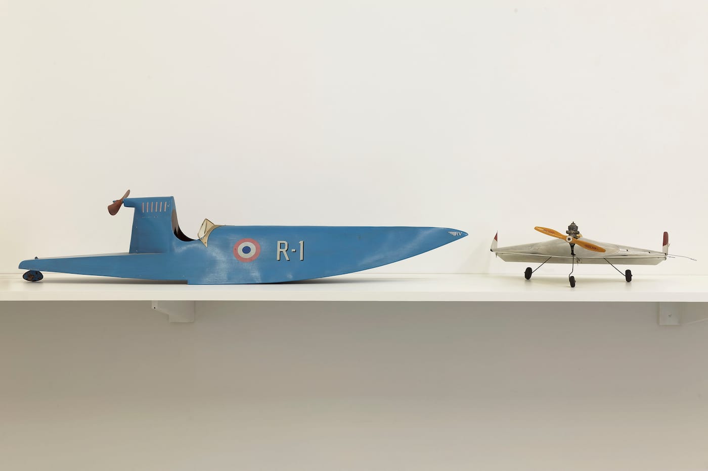 The playfulness we sense in “Untitled” becomes manifest and sweet in the back gallery, where a shelf spans all four walls. Model planes, helicopters, rockets, motorboats, submarines, and vehicles of all sorts from different periods sit on the shelves, many with motors. There are two German paperbacks by Max Valier (1895-1930), an Austrian rocketry pioneer who in 1927 helped found the Verein für Raumschiffahrt (VfR–“Spaceflight Society”), the world’s largest amateur rocketry society at that time. The title of one of the paperbacks is Raketen Fahrt (Rocket Ride) while the other is Der Vortoss in Den Weltentraum (The Advance into Space).