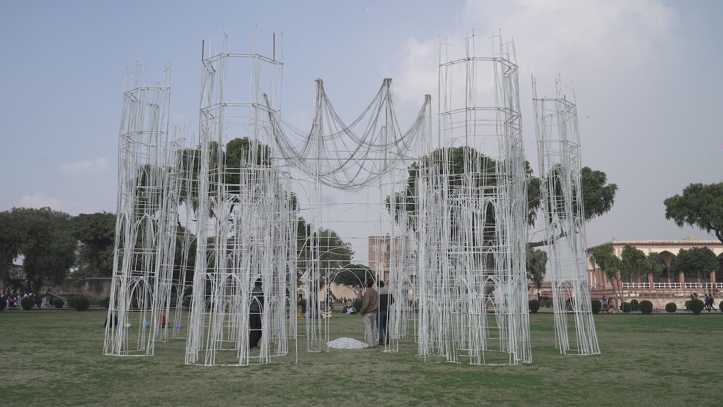 To organize LB 02 (as it is often called), the biennale enlisted acclaimed international curator, Hoor al Qasimi, best known as the President and Director of Sharjah Art Foundation. Twenty new artworks have been commissioned especially for the biennale. The majority of the eighty-nine selected artists (including two collectives and a painting club) are internationally based, hailing from the Gulf and UAE regions. The Lahore Fort displays Syrian born-American artist Diana Al-Hadid’s massive site specific steel and wire installation “The Escape of Anarkali” (2020), which, via the legendary fifteenth-century love affair between Mughal crown prince Salim (later Emperor Jahangir) and his ill-fated mistress Anarkali, alludes to the gigantic urban structures that have been erected in place of once-blooming flora. Pakistan’s oldest state school, Punjab University, houses seventeen artworks including contemporary works by Indian artists Nalini Malini and Vivian Sundaram, and Pakistani artist Ali Kazim. Other prominent venues include Al-Hamra Cultural Complex and Lahore Museum, displaying two and seven works respectively.