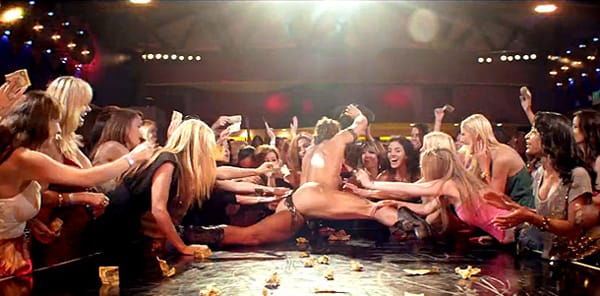 And the rowdy audience within the film seems to be having a lot more fun than the rest of us. What struck me the most were the shots of the all-women audience in Club Xquisite. The women writhe and shout, and even grope and grab at the dancers, literally shoving their hands into leather chaps and bejeweled thongs, and they even place their mouths over banana hammocks. Compare this to the audience in the movie theater, which was stationary as a corpse. As stationary as the fatsos eyeballing the broken down strippers in the BadaBing in The Sopranos.
