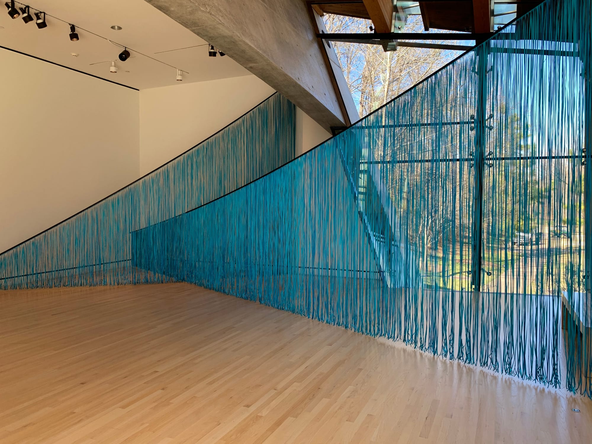 Other artists responded to the museum’s impressive architecture. In Cory Imig’s (Kansas City) elemental architectural intervention “Linear Spaces” (2020), two intersecting planes made of hanging blue satin ribbons, ratchet straps, and hardware are installed near large windows, channeling the sweeping blue sky into the space. You can slip through Imig’s satin curtainwalls to perceive the work and its surroundings from multiple perspectives.