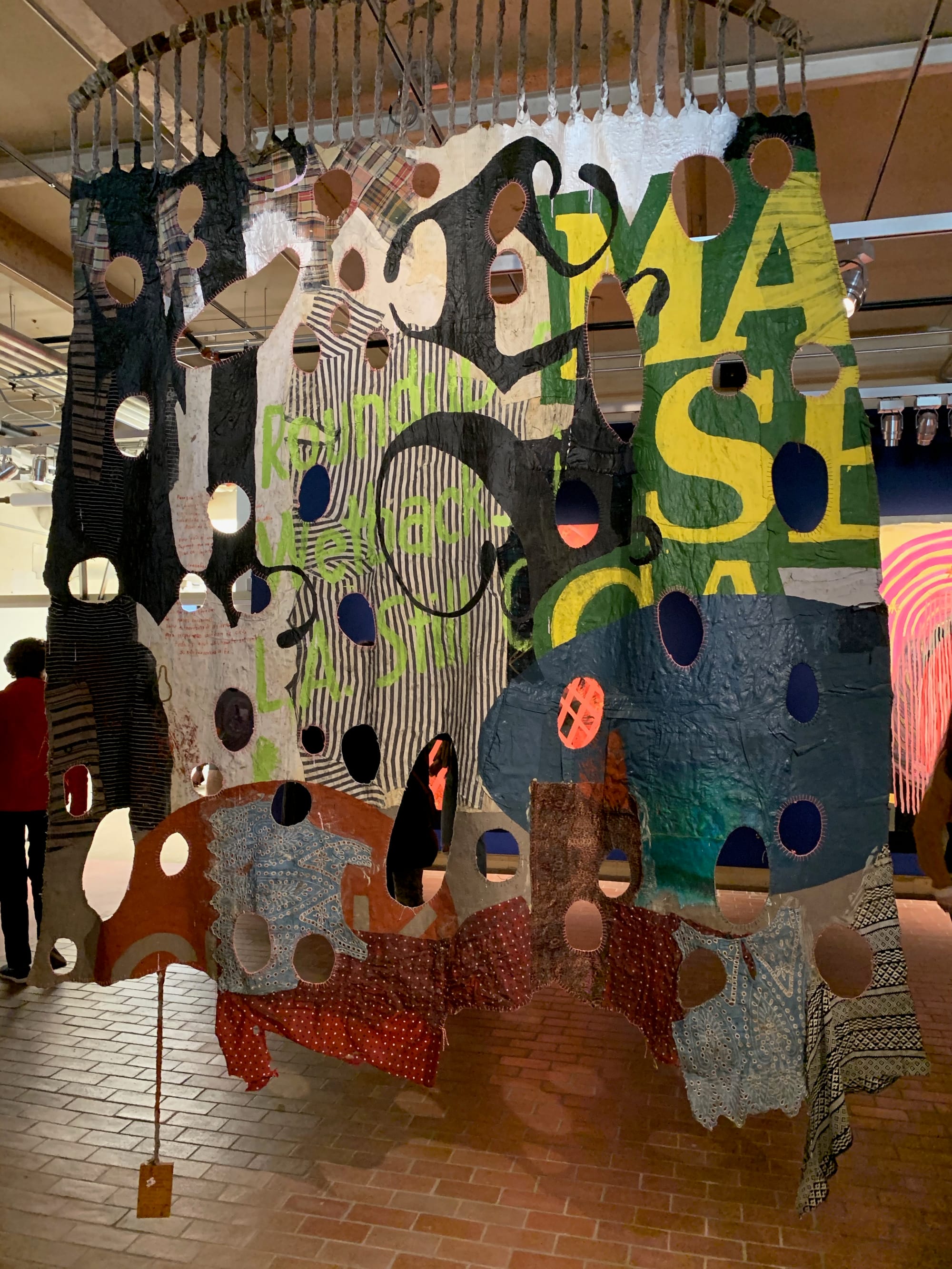 At the Momentary is the resplendent “Exodus” (2019) by Denver-based artist Suchitra Mattai. The monumental tapestry, stretching across much of a long wall and onto the floor, is composed of brightly colored vintage saris woven around a rope net. It is, for me, a highlight of the show. I was entranced by this dense fabric force filled with coursing blues, shimmering golds, vibrant reds, soft yellows, and many other colors in interlacing patterns; it’s a dimensional, physical “painting” sans paint, with abundant ruffles, ridges, and folds.