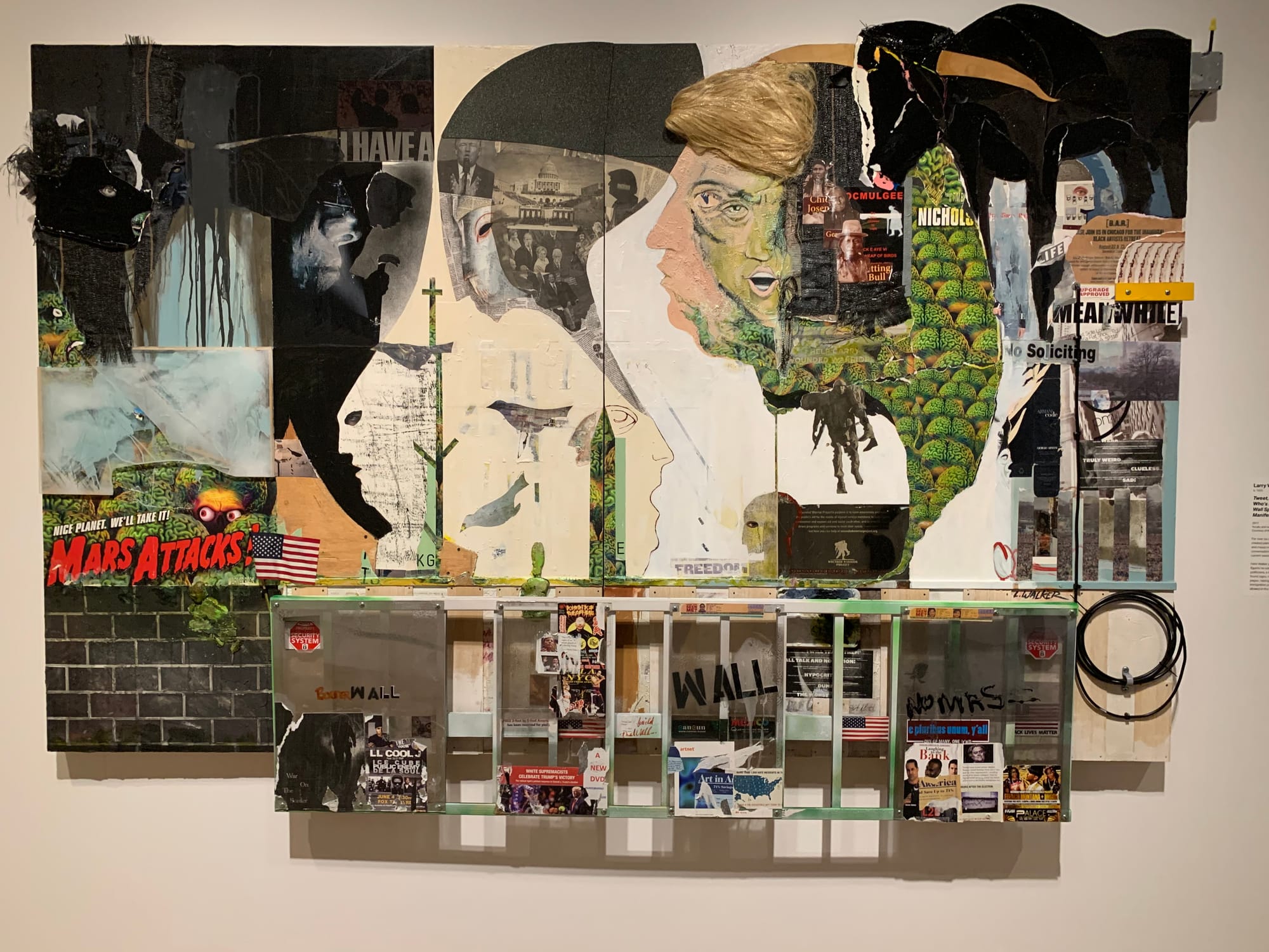 At Crystal Bridges, Larry Walker’s mixed media painting from 2017, amply collaged with snippets of text and three-dimensional components, is another highlight and its title is wonderful: “Tweet, Tweet…Look Who’s Here…or Aliens, Wall Spirits and Other Manifestations.”