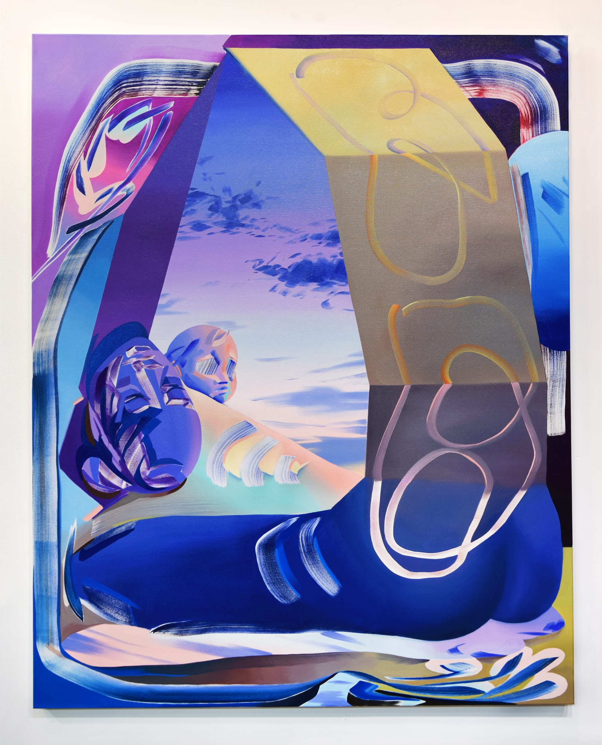 Painting is strong throughout the show. A standout is Nashville artist Karen Seapker’s atmospheric oil on canvas “Tent Mama” (2019) at the Momentary. A mother and child figure, composed of both angular geometric shapes and curving bodily ones, in a cool palette that conjures a science-fiction narrative, is an eccentric, yet deeply touching, vision of an attentive mother simultaneously towering over and protecting her young child.