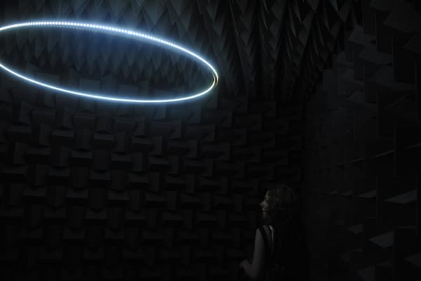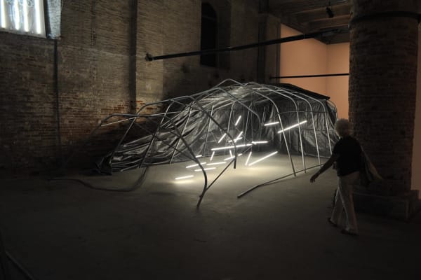 A view of Haroon Mirza’s “the national Apavilion of then and now.” Mirzawon was awarded the Venice Biennale’s Silver Lion for promising young artist.