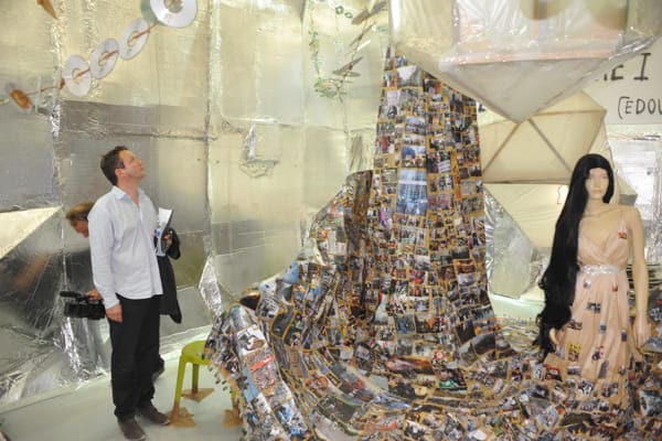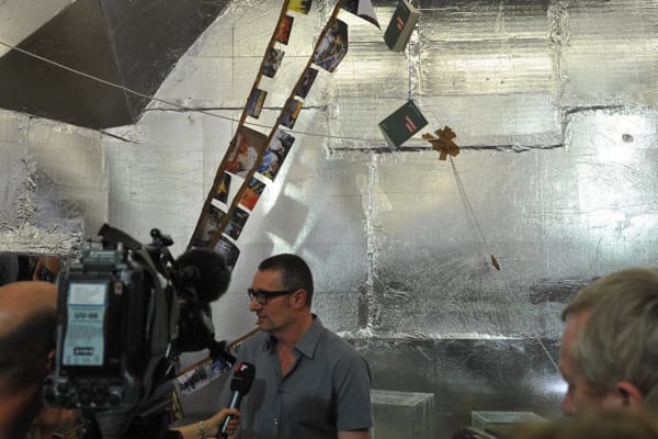 Thomas Hirschhorn being interviewed in front of his exhibition in