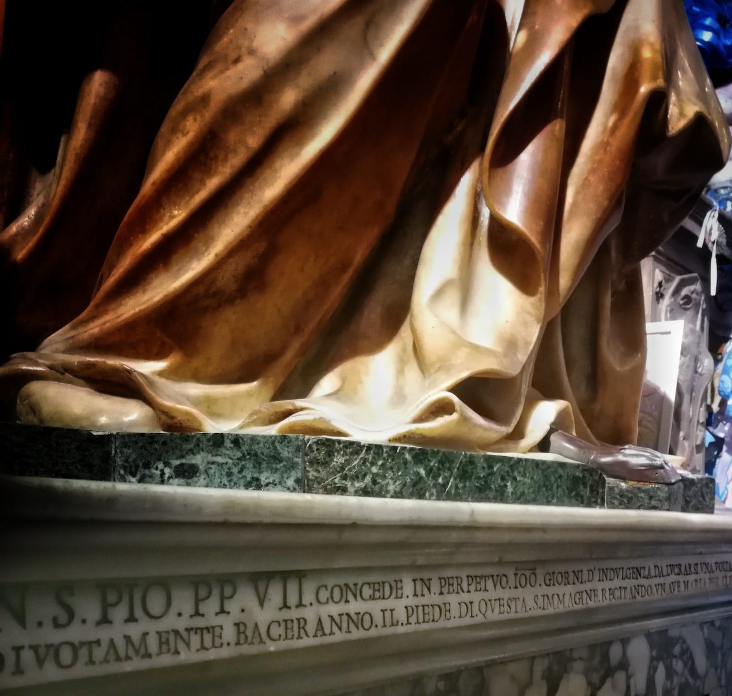 All over Rome there are traces of the same need for physical contact with the holy. In the church of Sant’Agostino there is a 16th-century statue of the Virgin of Child Birth, whose marble foot had to be replaced with silver because it was so worn from the touch of supplicants — usually anxious fathers expecting a difficult delivery. Now the metal foot is also worn smooth. Two small marble crosses were inserted into opposite piers of the Colosseum, which was thought to be a site of Christian martyrdom. An inscription below each cross states the number of years and days you would be spared Purgatory if you kissed it. Theoretically you could go back and forth between these crosses and kiss your way out of Purgatory. If this all sounds like a recipe for disease transmission, it probably is.