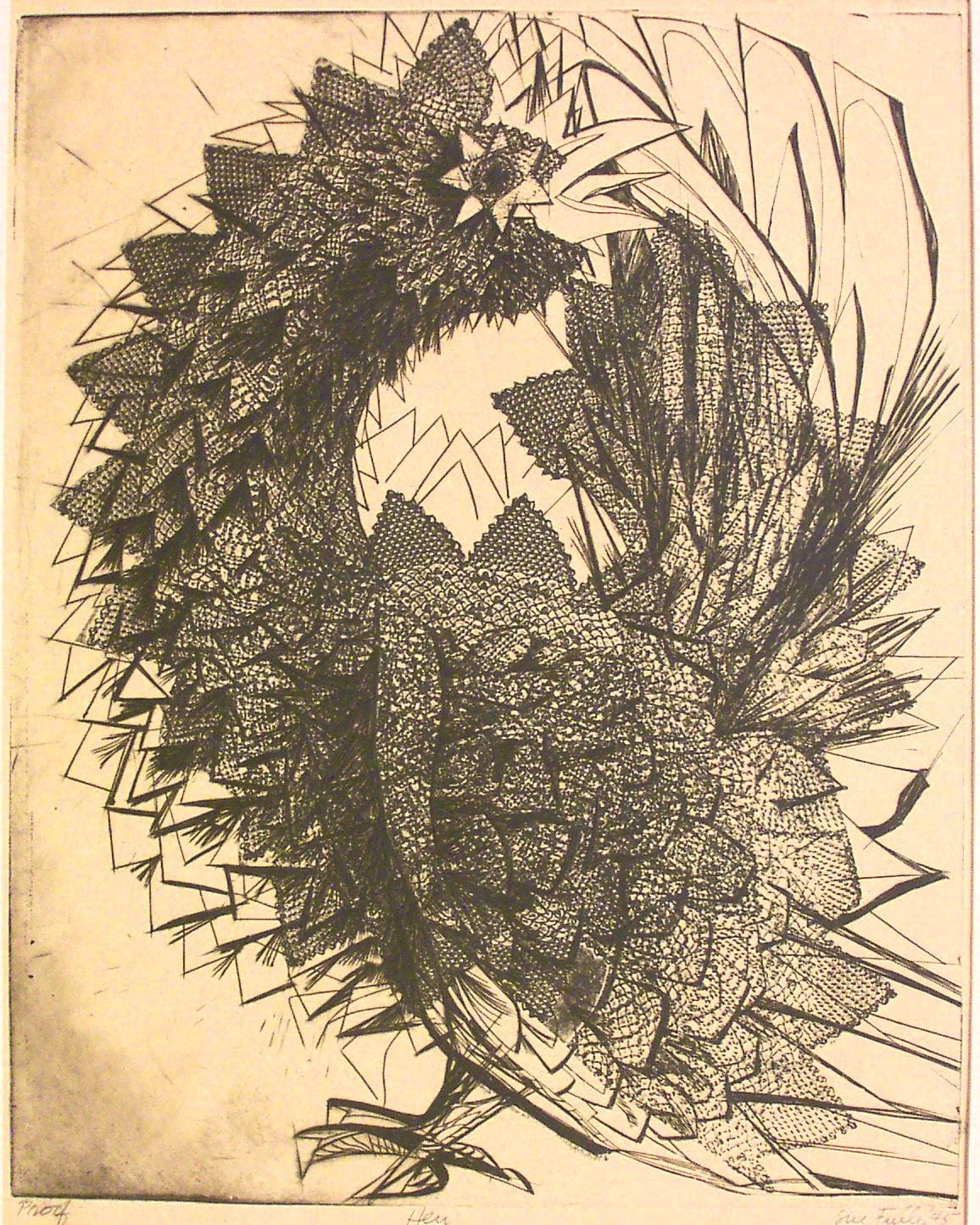 Weyl carefully examines the divergent critical responses to men’s and women’s work. In 1943, Hayter and Anne Ryan exhibited prints created through an almost identical technical process. Critics praised Hayter’s “control of sinuous swirling line,” while Ryan’s “delicate etchings” were seen as less assured, “sensitive and essentially feminine.” Sue Fuller’s introduction of lace, string, and other textiles to soft ground etching was a creative move that prefigured Miriam Schapiro and “femmage” of the 1960s and ’70s. Though the innovation was Fuller’s, one critic claimed the technique clearly showed the influence of “the master” Hayter.