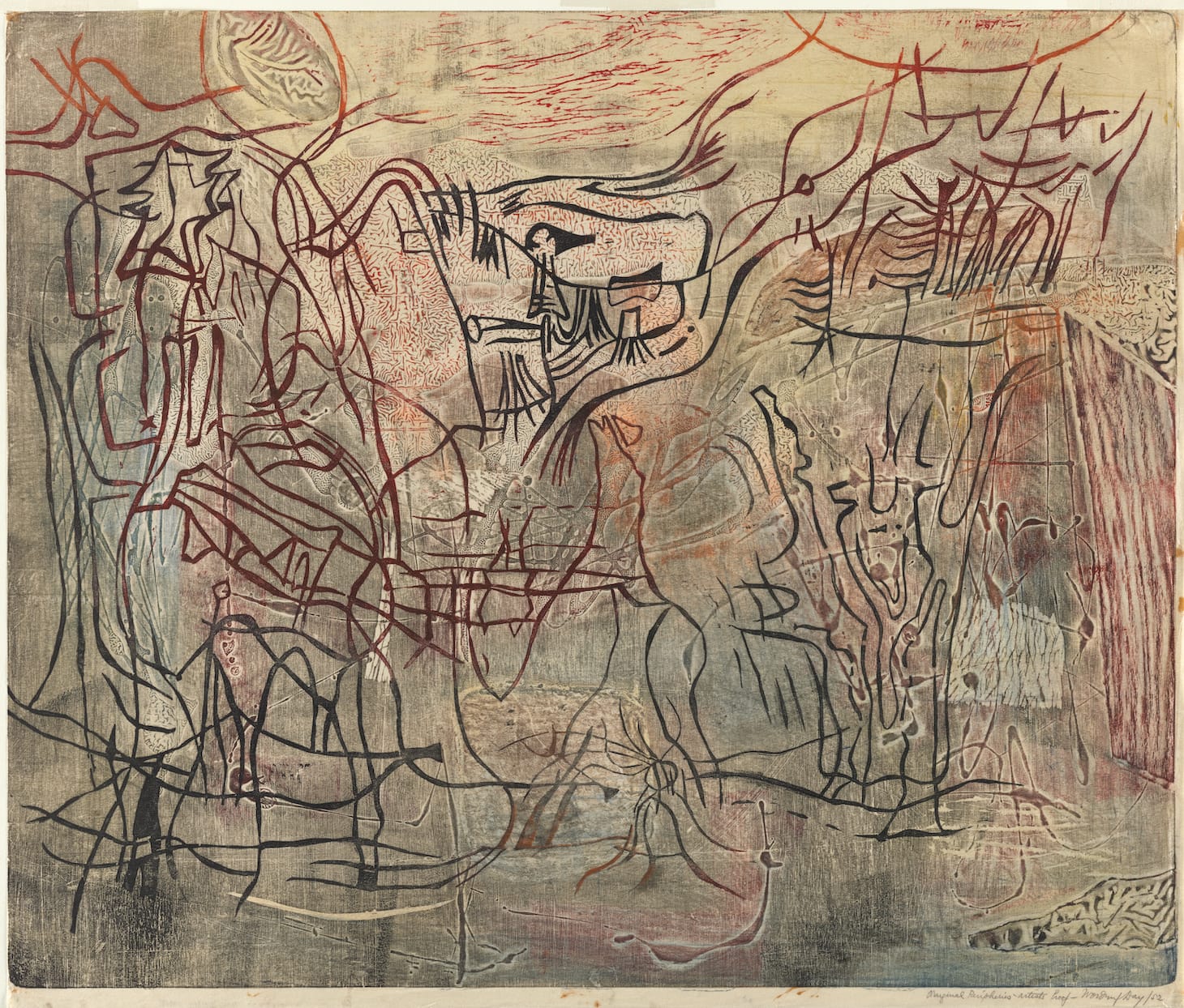 Worden Day, among others, created prints that echoed the spiritual and philosophical concerns that “permeated the New York School’s smoke-filled hangouts” where Greenberg and other critics held court. Her large-scale woodcut “The Burning Bush” follows her spiritual journey from a Southern childhood listening to Evangelical preachers though her pursuit of Buddhism and Christian Science, finally landing in Catholicism. Yet Greenberg’s 1948 review of her first solo show characterized her originality as “narrow,” claiming that “despite the mystical pretentions announced by the titles,” her work “does not say enough yet to be important.”