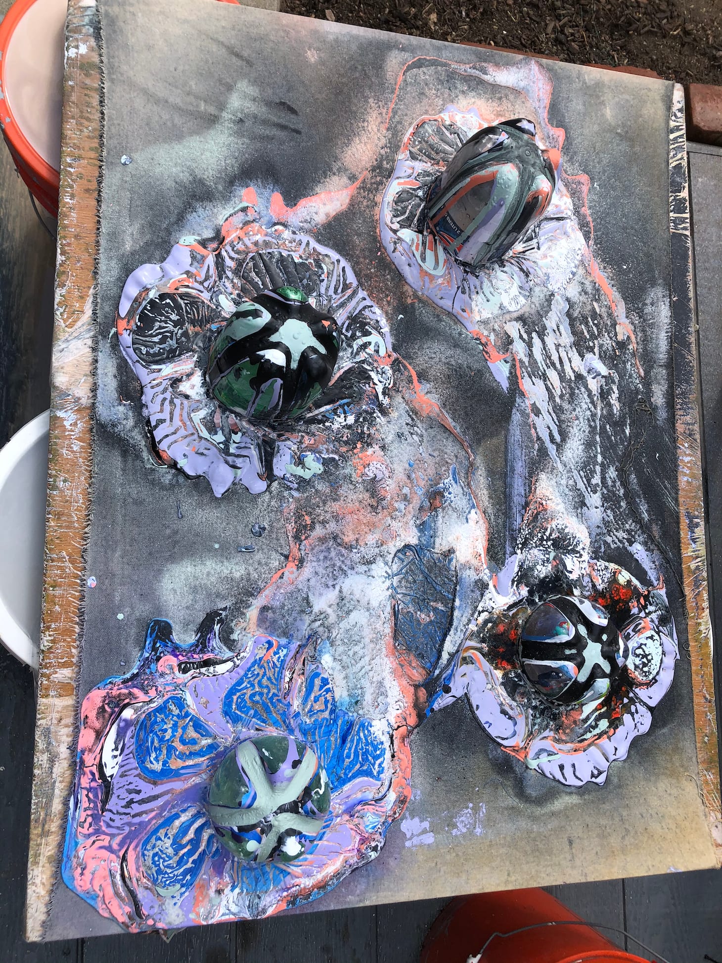 An art professor at the University of Southern California (USC), Arceneaux is also navigating online education for his Advanced Painting course and coming up with ways to maintain a spirit of connection virtually. He set up cameras in his studio and encourages students to sign onto Zoom in the evenings and paint together — no conversation necessary. Having focused on performance and theater-based projects more recently, he’s returning to painting for the first time in years — experimenting with poured paint over plastic vessels. His daughter often joins him on the project, which he documents on Instagram.