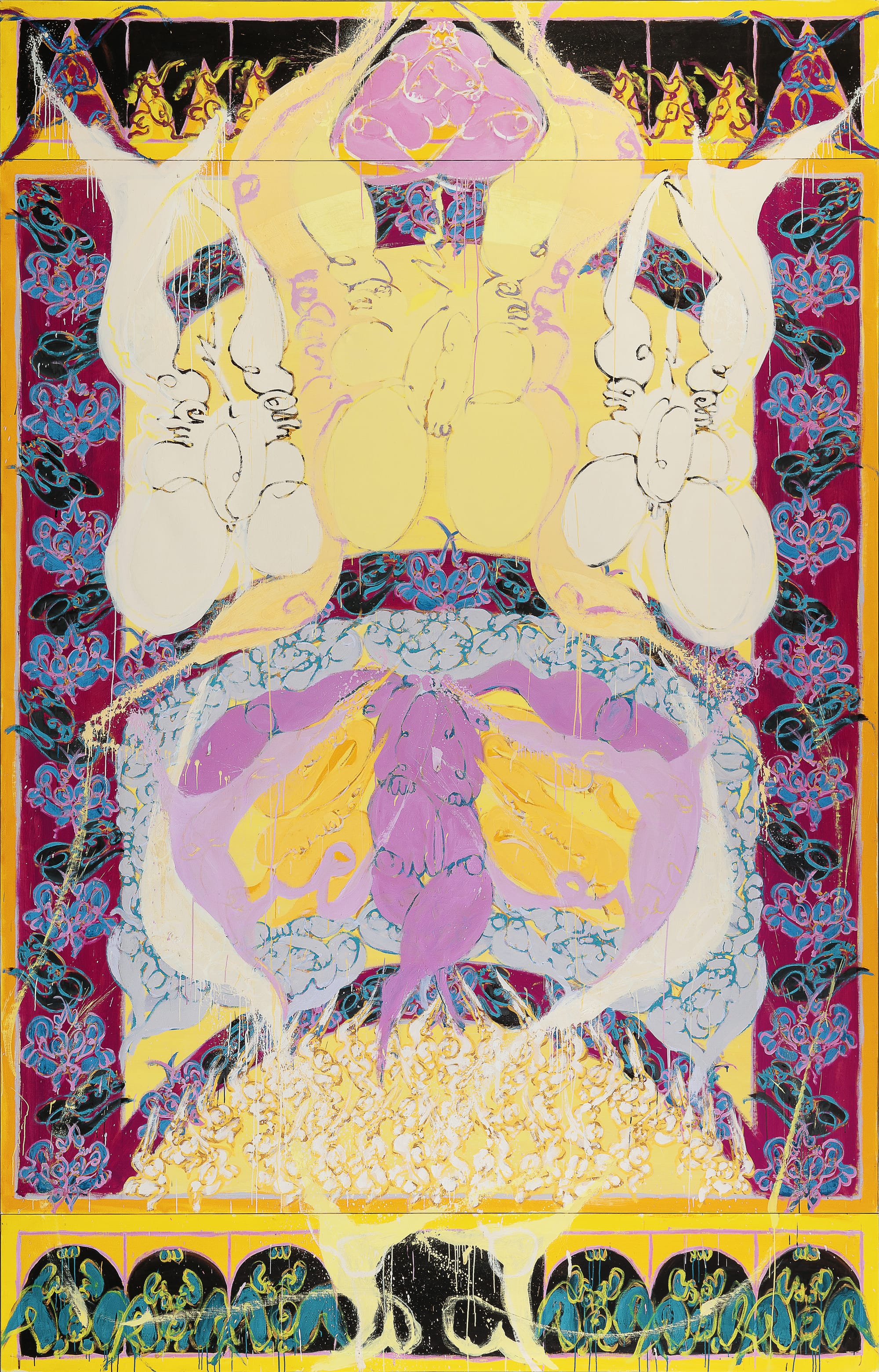 His work anticipates the waterfall paintings of Pat Steir, the flower paintings of Cy Twombly, Judy Ledgerwood’s use of blacks and pinks, purples and magentas, the dense concatenations of Philip Taaffe, and his embrace of the occult.