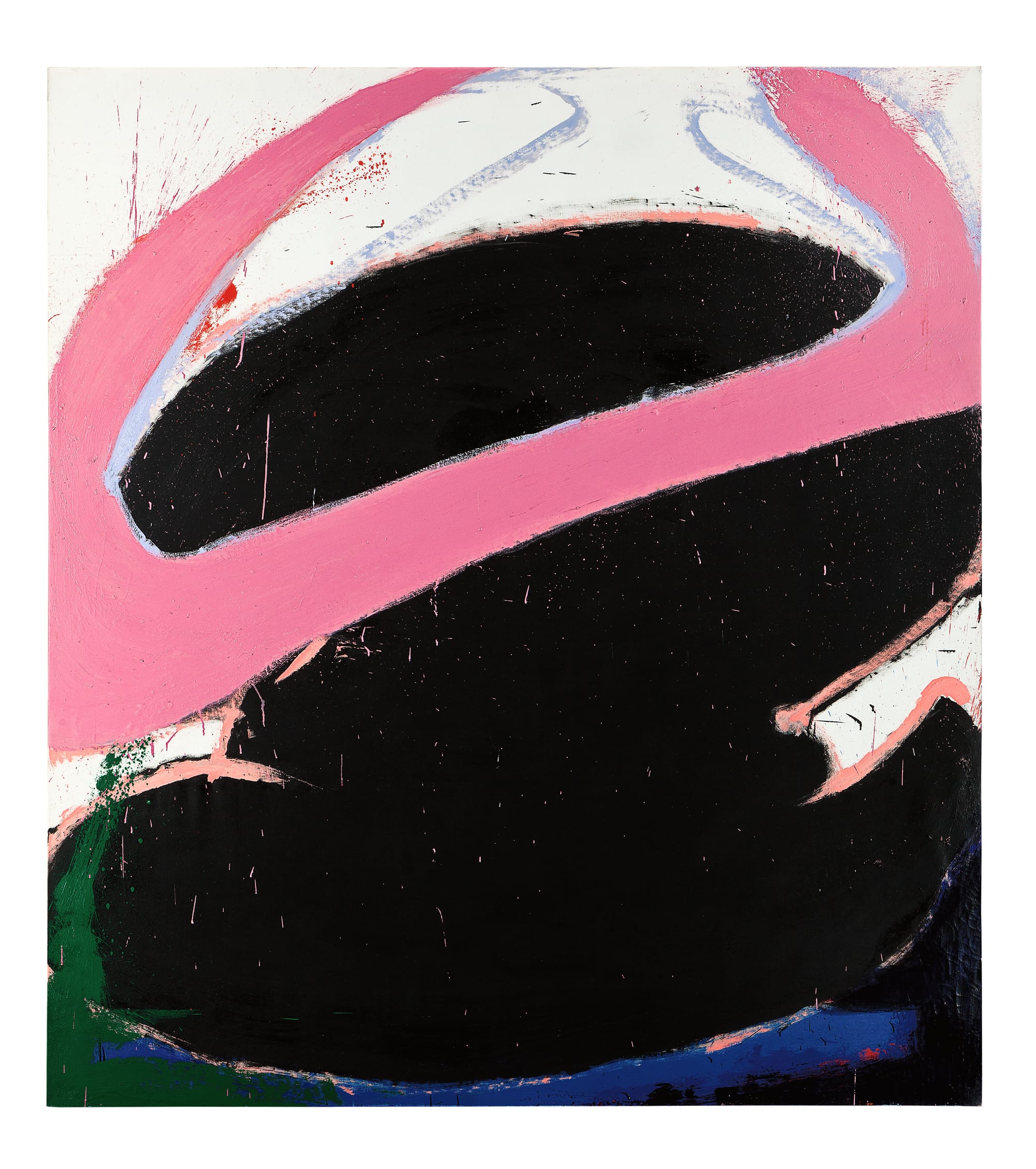 This is what I believe Bluhm has never gotten credit for: he transformed the vocabulary we associate with the gestural branch of Abstract Expressionism into something that others of the so-called Second Generation did not pursue, much less attain. Between 1967 and ’71, when gestural painting — long regarded as derivative of Willem de Kooning and Franz Kline — had been superseded by Pop Art, Color Field painting, Minimalism, and Conceptual Art, Bluhm transformed line and gesture into sinuous shape and frozen liquidity.