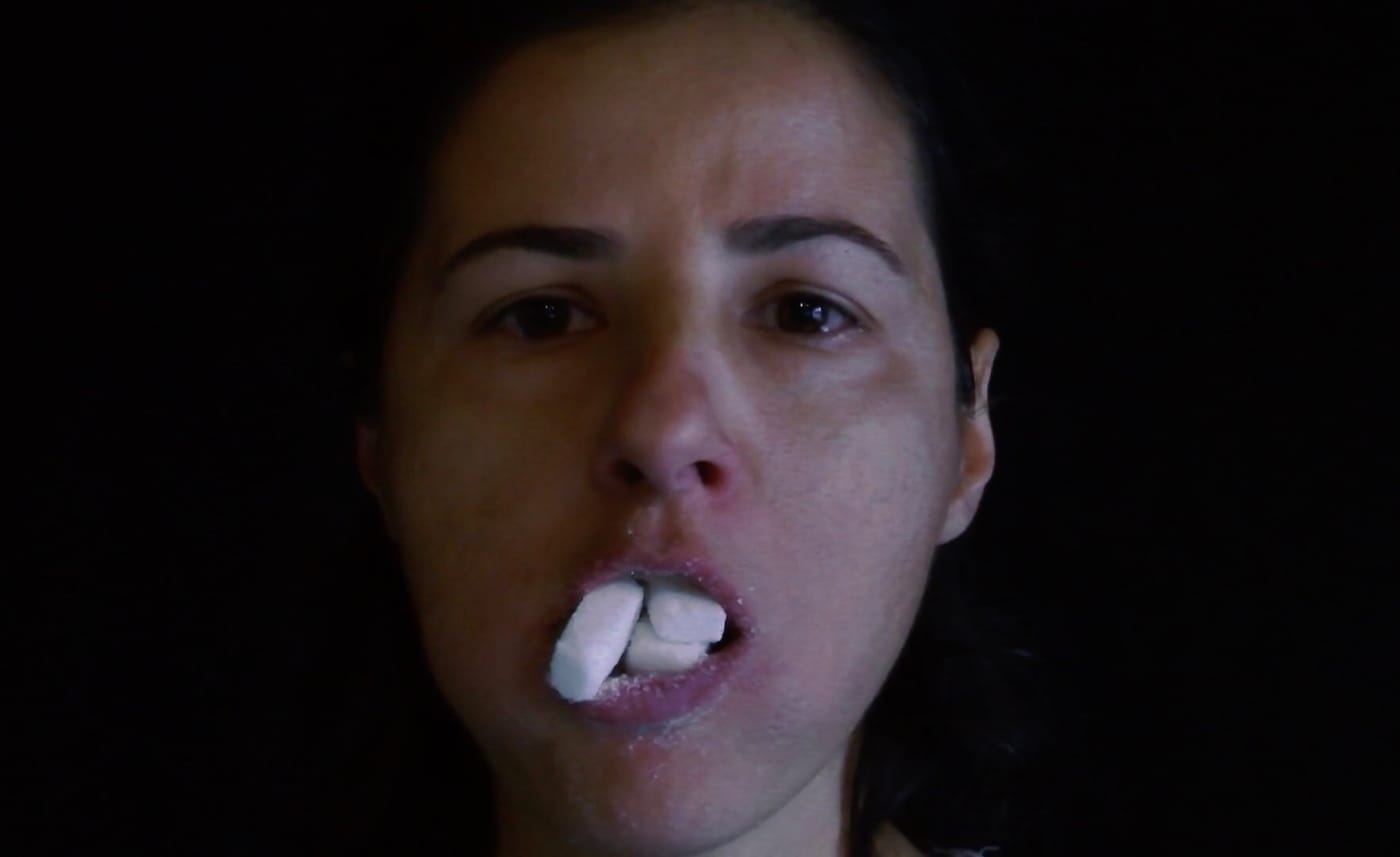 “Abandoned,” by Serbian artist Sanja Latinović, was made in the pandemic’s grip. The sugar cubes are more like sugar slabs, wide and thick. She crams them into her mouth like a starving refugee.