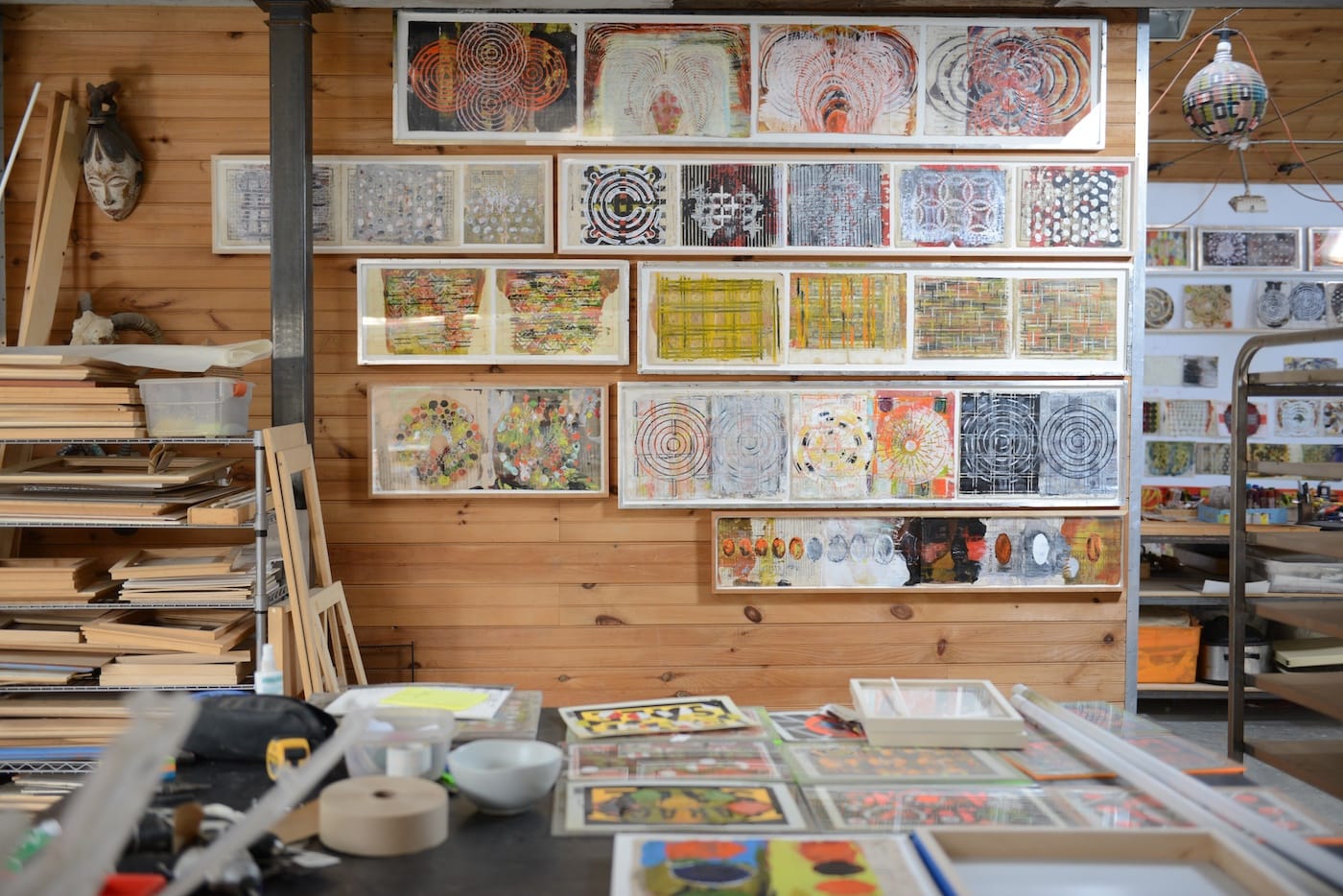 The room where we settle in to talk is a “drawing” studio: recent paintings on paper cover the walls in rows from floor to ceiling. She calls it the most private of the spaces, one which her assistants never enter. Although Pfaff is considered a sculptor and installation artist, her work incorporates painting throughout, and is orchestrated in a painterly manner. Despite the size and virtuosity of their engineering, her installations are approachable: there are human-scaled parts, like these small paintings on paper, familiar patterns, and photographic images.