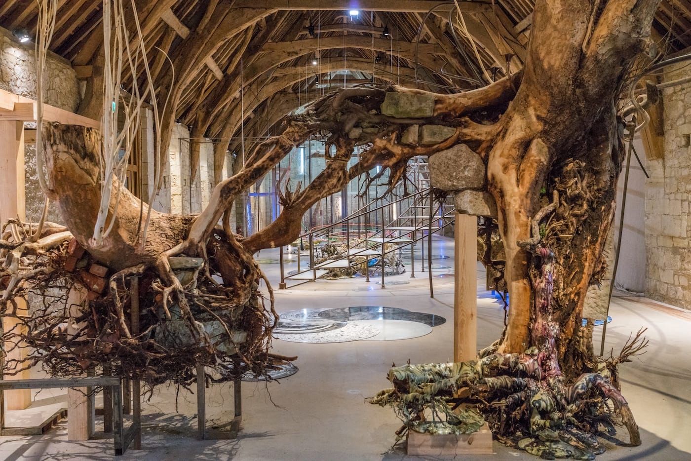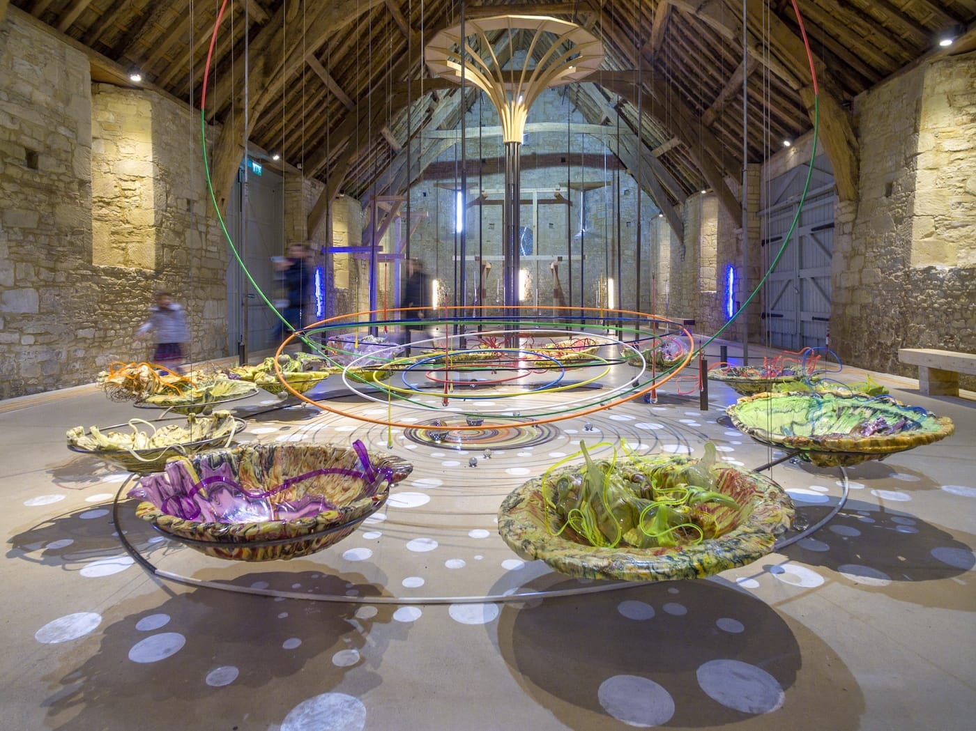 But the most specific and important installation to me was Tivoli-Tisbury: A Romance (2017). I live and work in Tivoli, New York. Tisbury is in Wilshire, England. It was my first show in England, and I was going back to where I was born, and where I had worked at a Rudolf Steiner College in 1966. I was invited to a 13th-century tithe barn. It was the most beautiful space I have ever seen. It was an epic, full year of work: to prepare and research, to ship parts and equipment in a container, and finally, to be in residence for a few months. The small town of Tisbury is near Stonehenge, Woodhenge, and Salisbury Cathedral. Stone for the cathedral was quarried there. The history, beauty, and power of the landscape was overwhelming. Paying homage to the place, and acknowledging the people and its deep history consumed me. I learned so much.