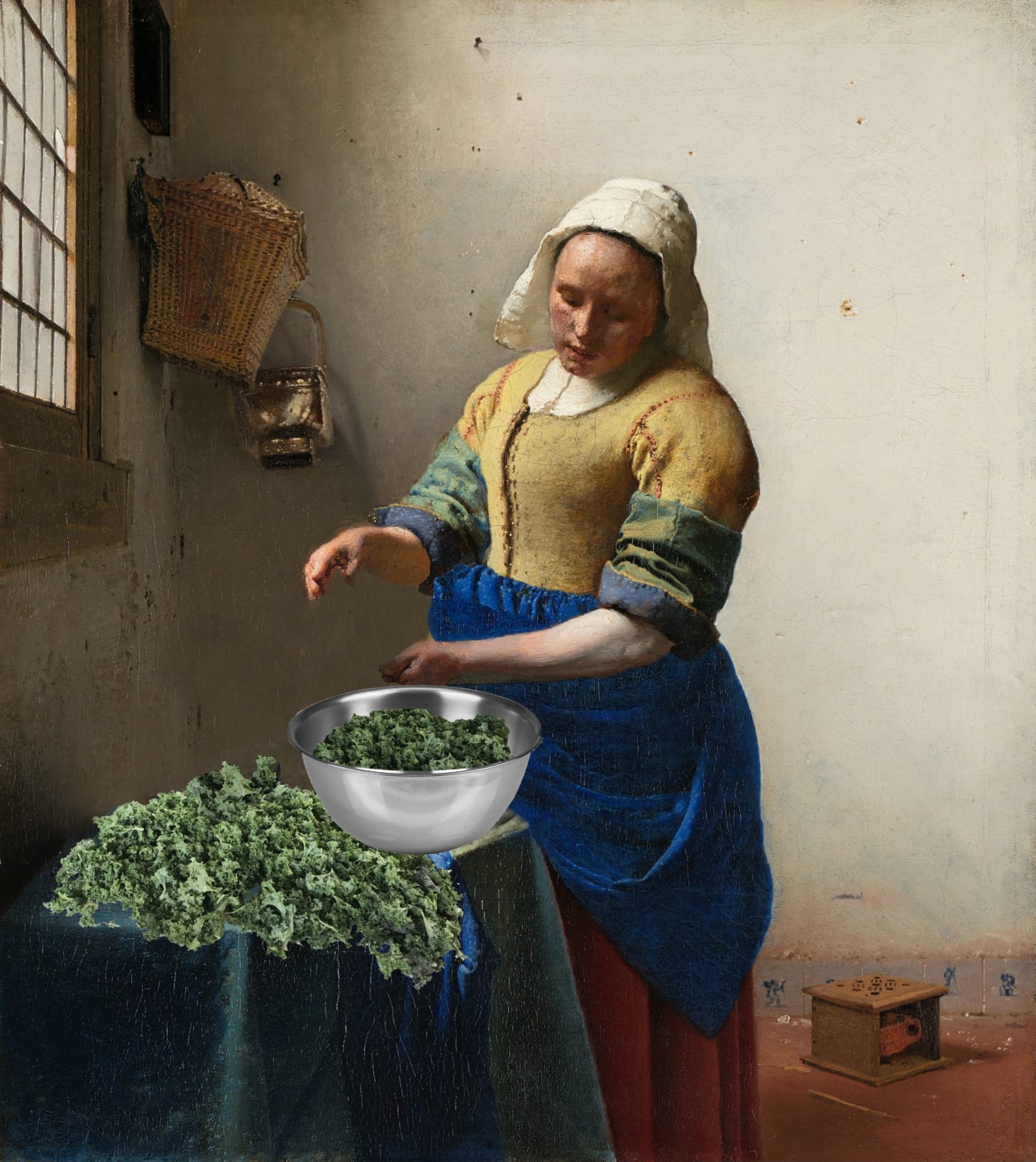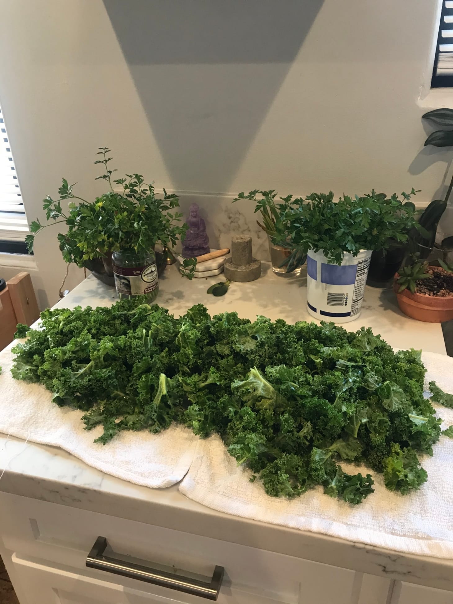 Drain kale, squeeze out all water thoroughly, and lay it out to dry. Lay out onto towels, rolling up and squeezing with kitchen towels that you don’t mind turning green.
