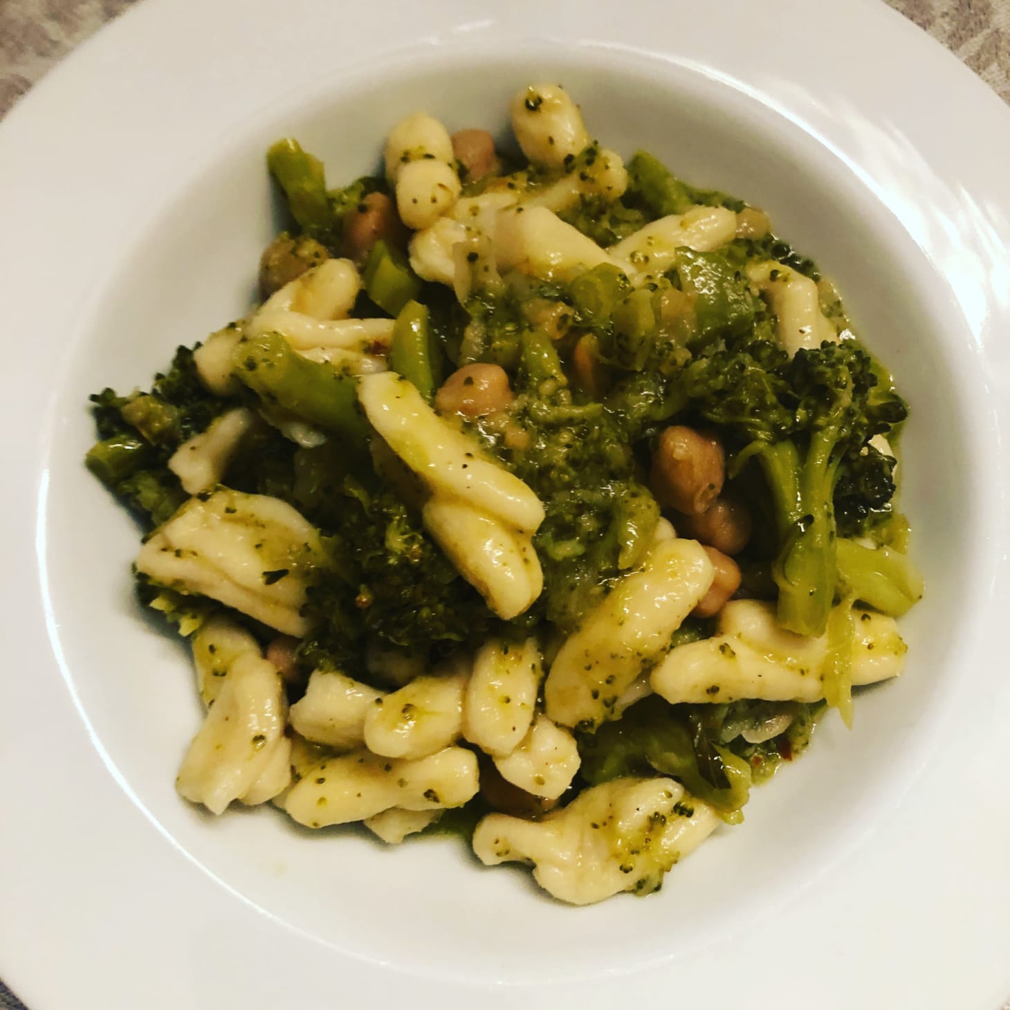 Once the sauce is done, cook the pasta in salted water reserving a cup or so of the cooking liquid before draining. Cook the pasta a little less than you typically would and add it to the broccoli and ceci, along with the reserved pasta cooking liquid. Combine the sauce, pasta, and liquid, cooking on a medium flame until the liquid is absorbed and the pasta is al dente. Serve it right away with parmigiano grated on top and a bit of fresh olive oil.