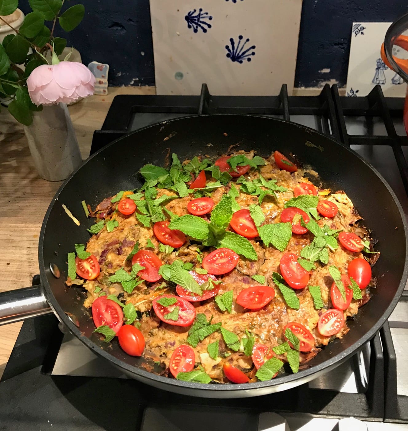 To my mind, this recipe tastes of spring: mint, lemon, garlic, chili, and zucchini. It emerged from memories of eating chickpea fritters in Italy and seeing something similar on Instagram, I forget where. You can rustle it up in 20 minutes but be warned: sometimes it works and sometimes it doesn’t — alchemy plays a part in its success. If there are vegetables you like more than zucchini you can use them of course, but it they’re hard (like potatoes) best to roast them first. You could also add beans, red peppers, or anything else you like. It’s a recipe to play around with.
