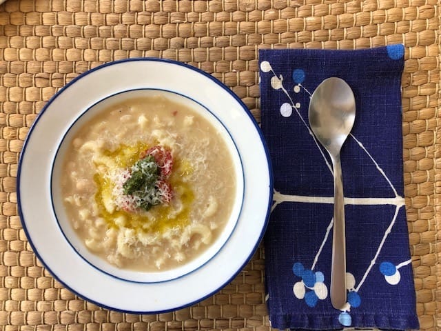 “Summer soups call to mind gazpacho or chilled cucumber, but this white bean soup also falls into the summer soup category, or at least helps bridge the seasons. It comes from Viana La Place’s cookbook Verdura. La Place has a warm and devoted following, deservedly. She co-wrote wonderful cookbooks with Evan Kleiman like Cucina Rustica and Pasta Fresca, both focused on fresh, seasonal but unpretentious cooking. Verdura, I find, gets fewer mentions, but I keep it close by in the kitchen for ideas, especially around this time of year. The book features lots of herbs, vegetables, hot pasta, cold rice, stone fruits, and simple but creative ways of putting them all together. This white bean soup is just one example.
