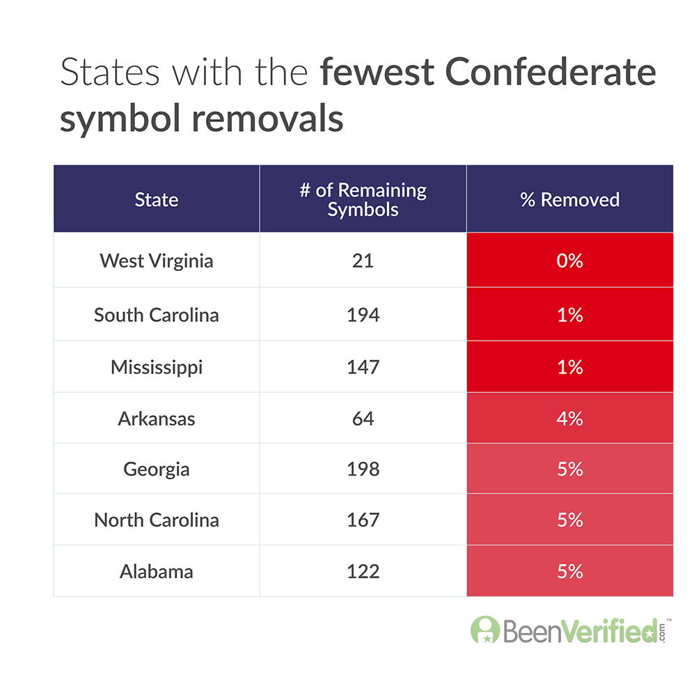 The states that have the largest number of remaining monuments are West Virginia, where none have been removed; 99% of monuments in South Carolina and Mississippi remain standing; and 96% remain in Arkansas. They are followed by Georgia, North Carolina, and Alabama, all of which have 95% of their monuments in tact.