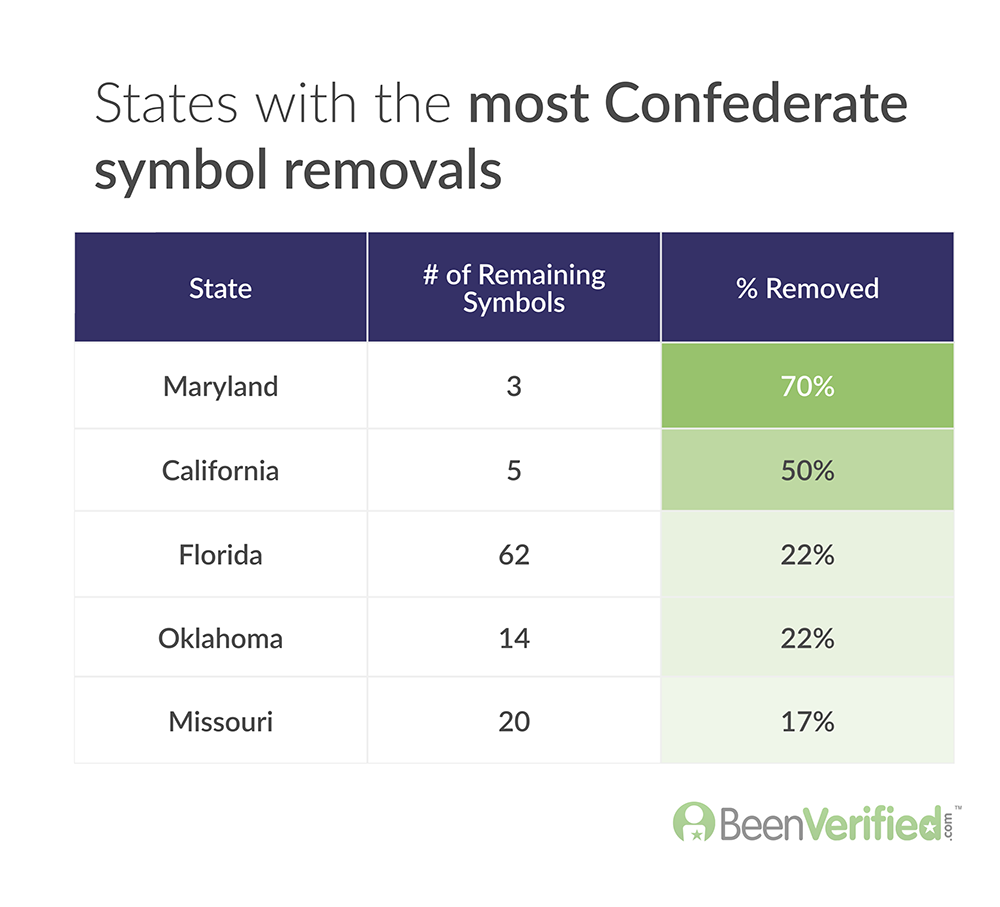 The states with the top percentage of removals (out of states that had at least 10 Confederate symbols) are Maryland, which removed 70% of its monuments over the years, and California, which took down 50%. Next on the list are Florida and Oklahoma (22%) and Missouri and the District of Columbia (17%).