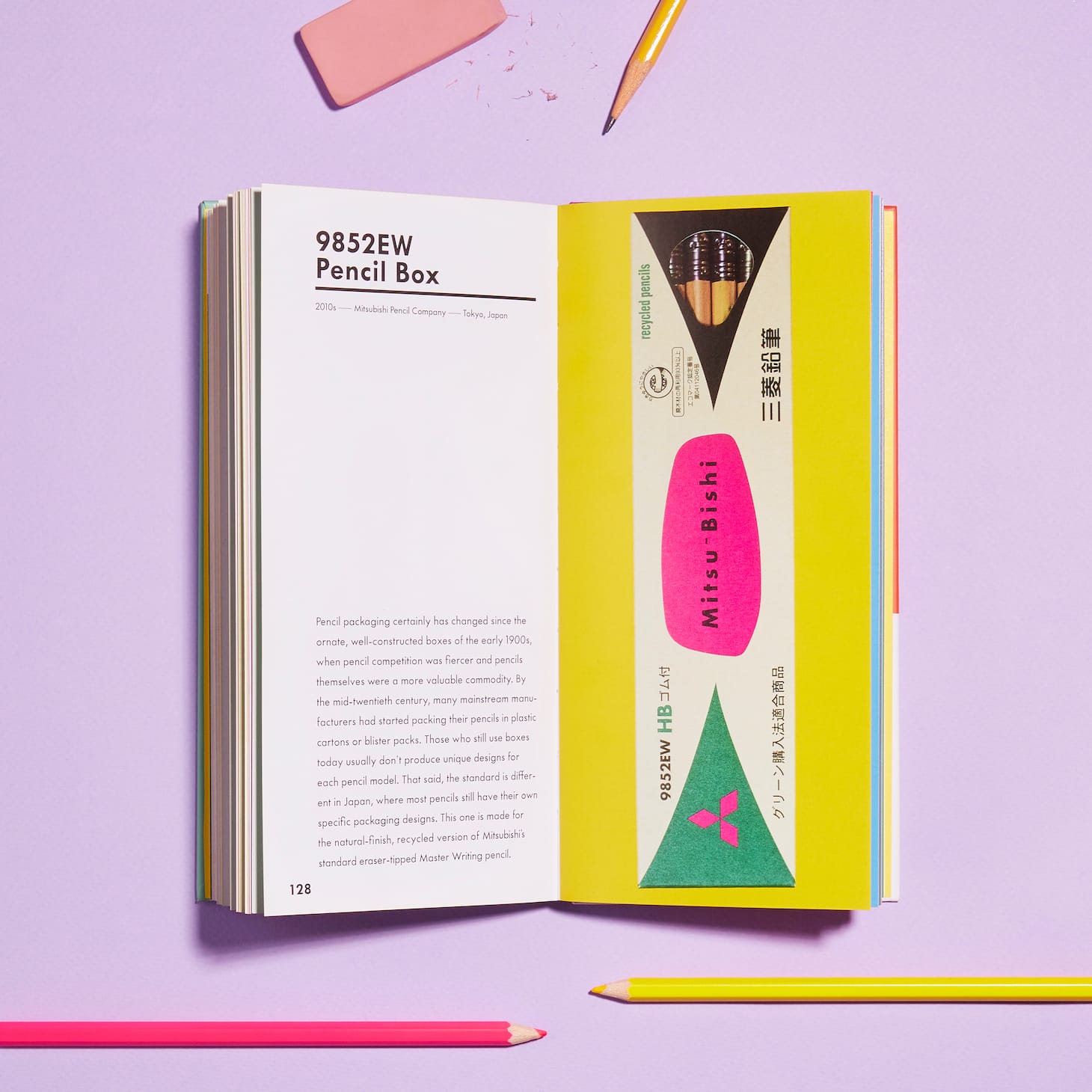 Weaver’s book, Pencils You Should Know, is shaped like a palm-sized pencil box. Each spread highlights the story of a notable pencil, which is photographed school-portrait style on bright backdrops. “The pencil is a curious object,” Weaver writes in the introduction. “Everyone is familiar with it, yet most people don’t actually know much about it.”