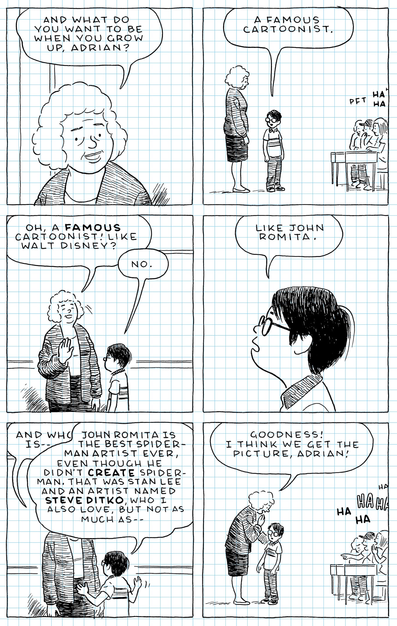 Spanning from 1982 to 2018, each usually only 20 to 30-panel-vignette, opens with a year and location, allowing the reader to travel across time and space with Tomine from his youth in Fresno, California, to his life as a husband and father in Brooklyn. The book reads as a series of remembrances, heightened by a design scheme that mimics a graph-paper sketchbook. Most of the dialogue is internal — square after square reveals Tomine’s running anxieties and insecurities, never spoken aloud as he works and travels alone.