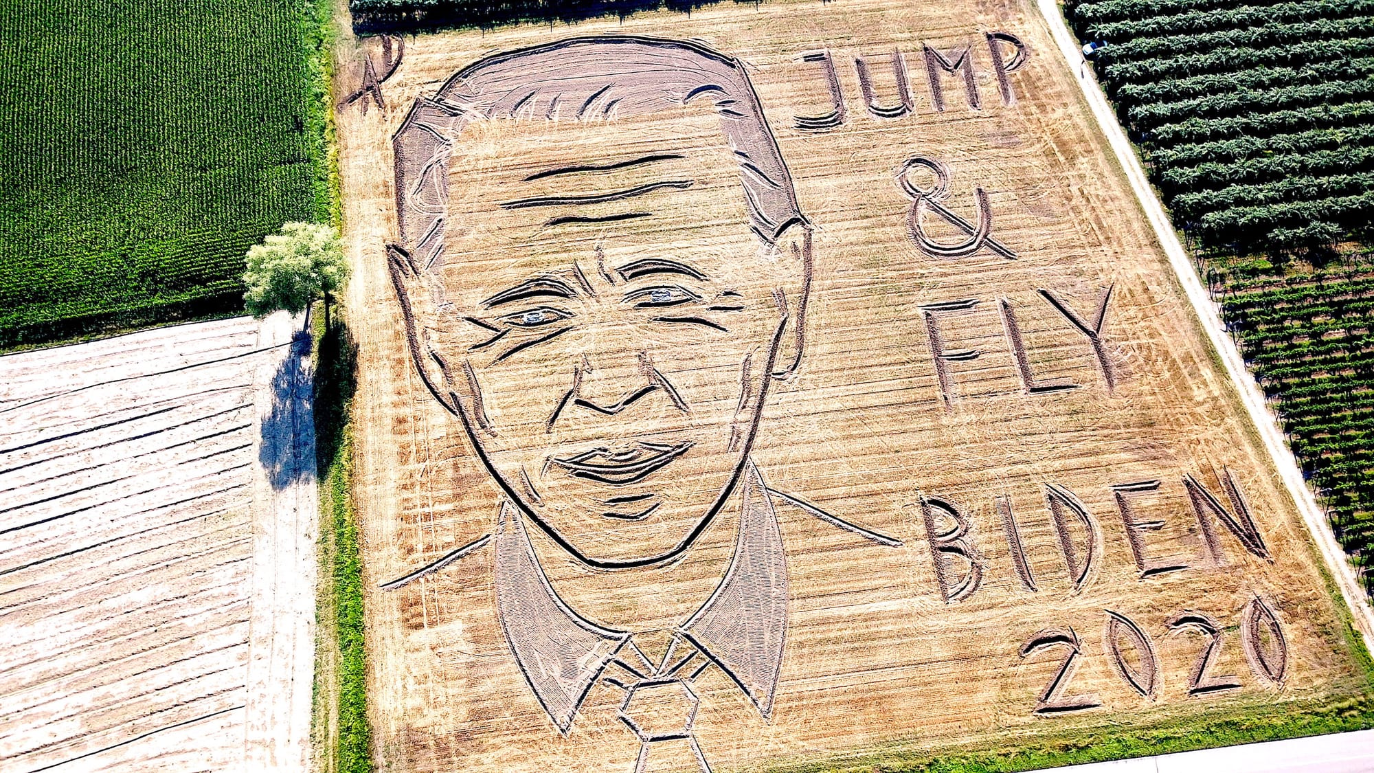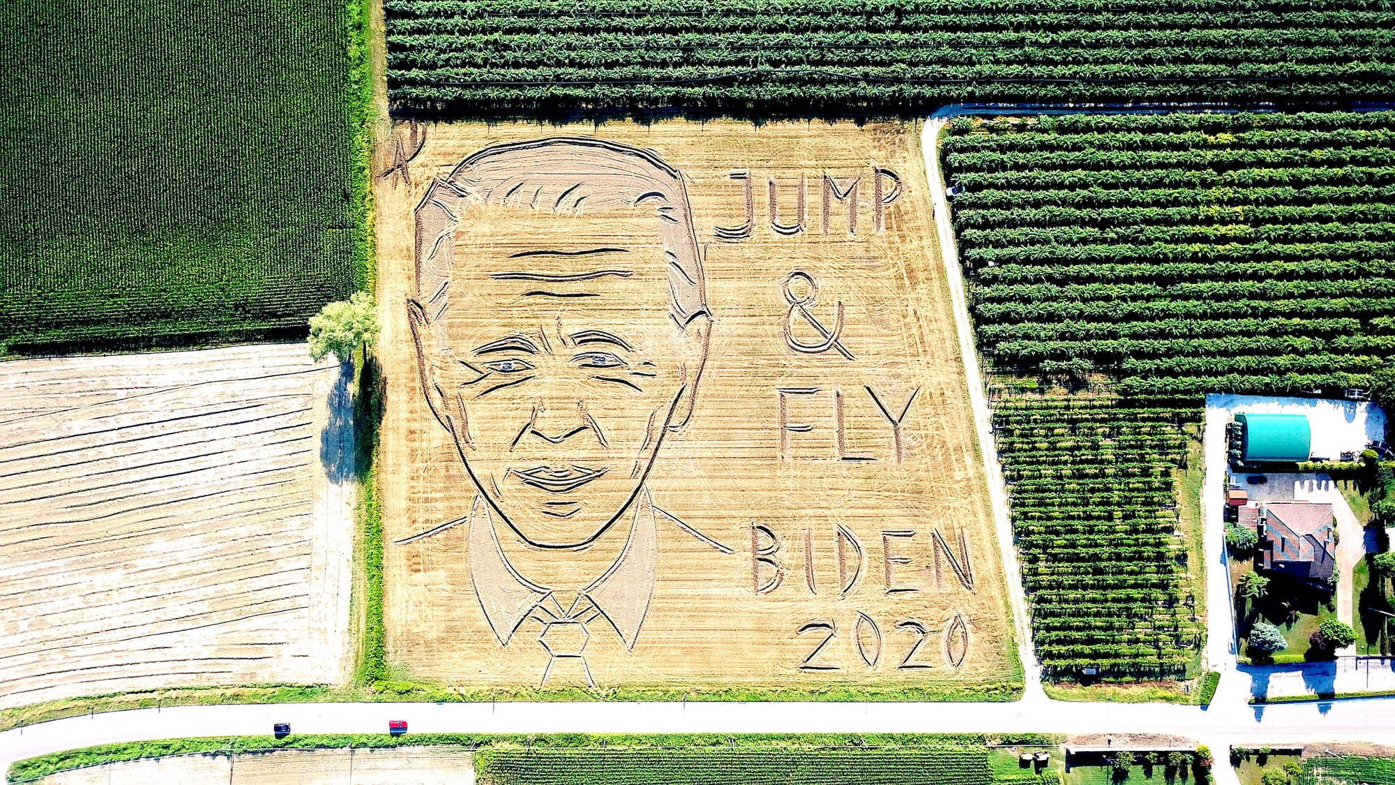 Dario Gambarin created a portrait of the Democratic presidential candidate in a field near Verona with "Jump & Fly, Biden 2020." But why?
